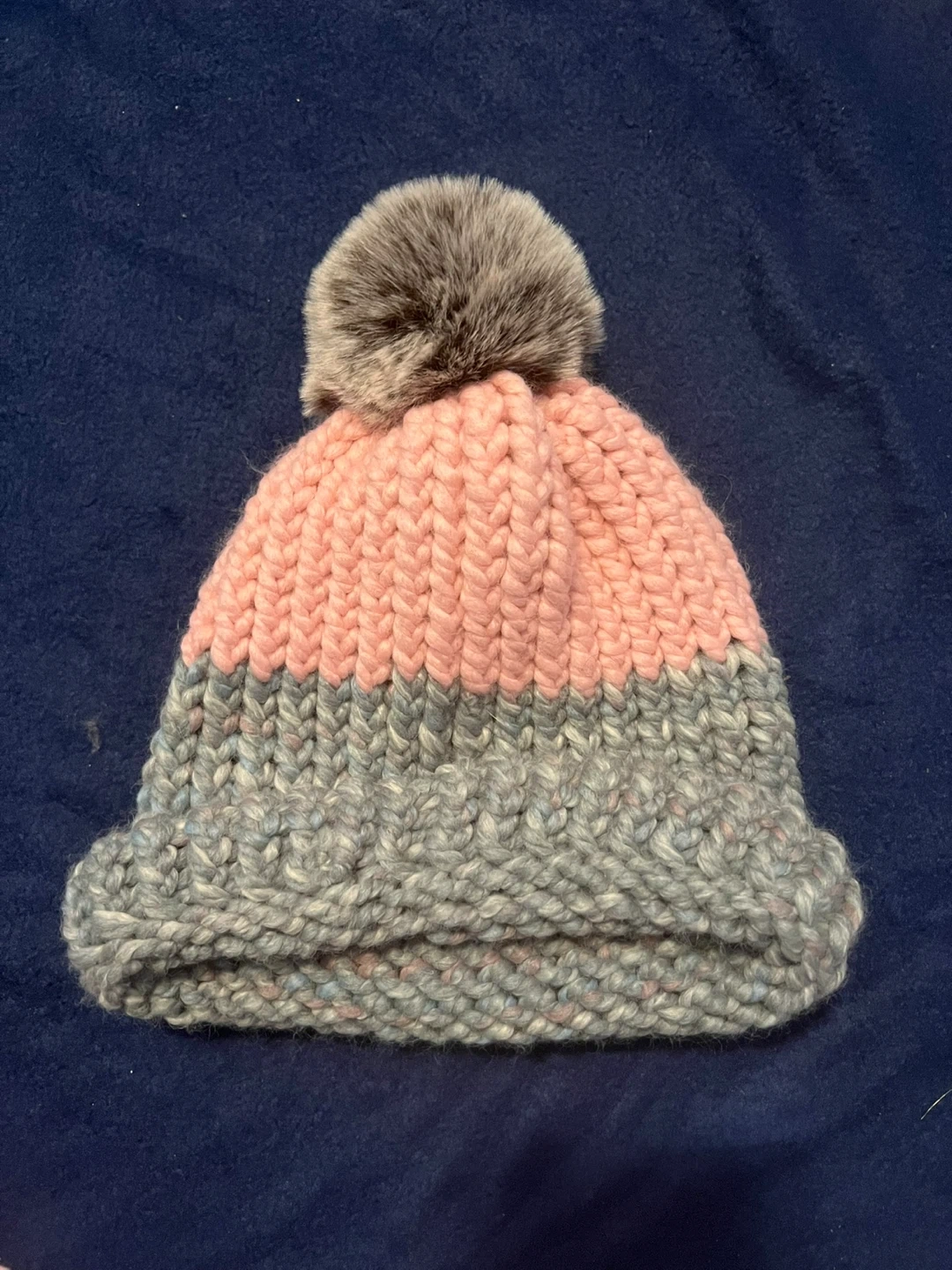 Selling a few cozy knit beanies! There's a pink one, a grey one, and a two-tone pink and grey beanie with a pompom. Perfect for keeping warm this winter!