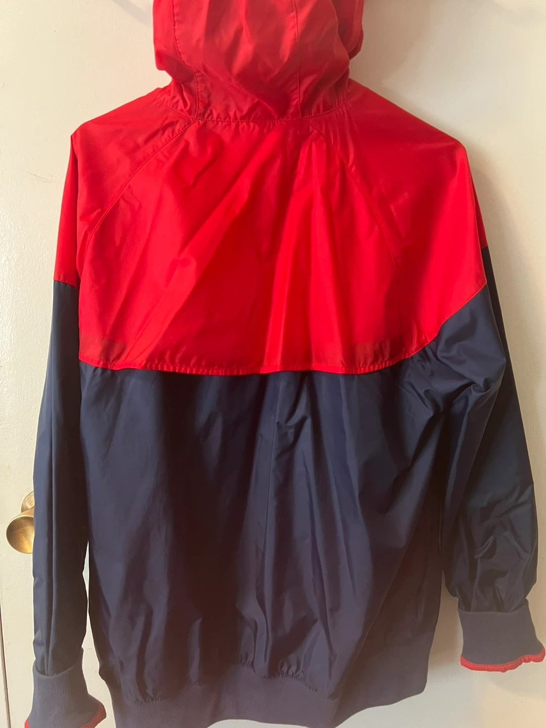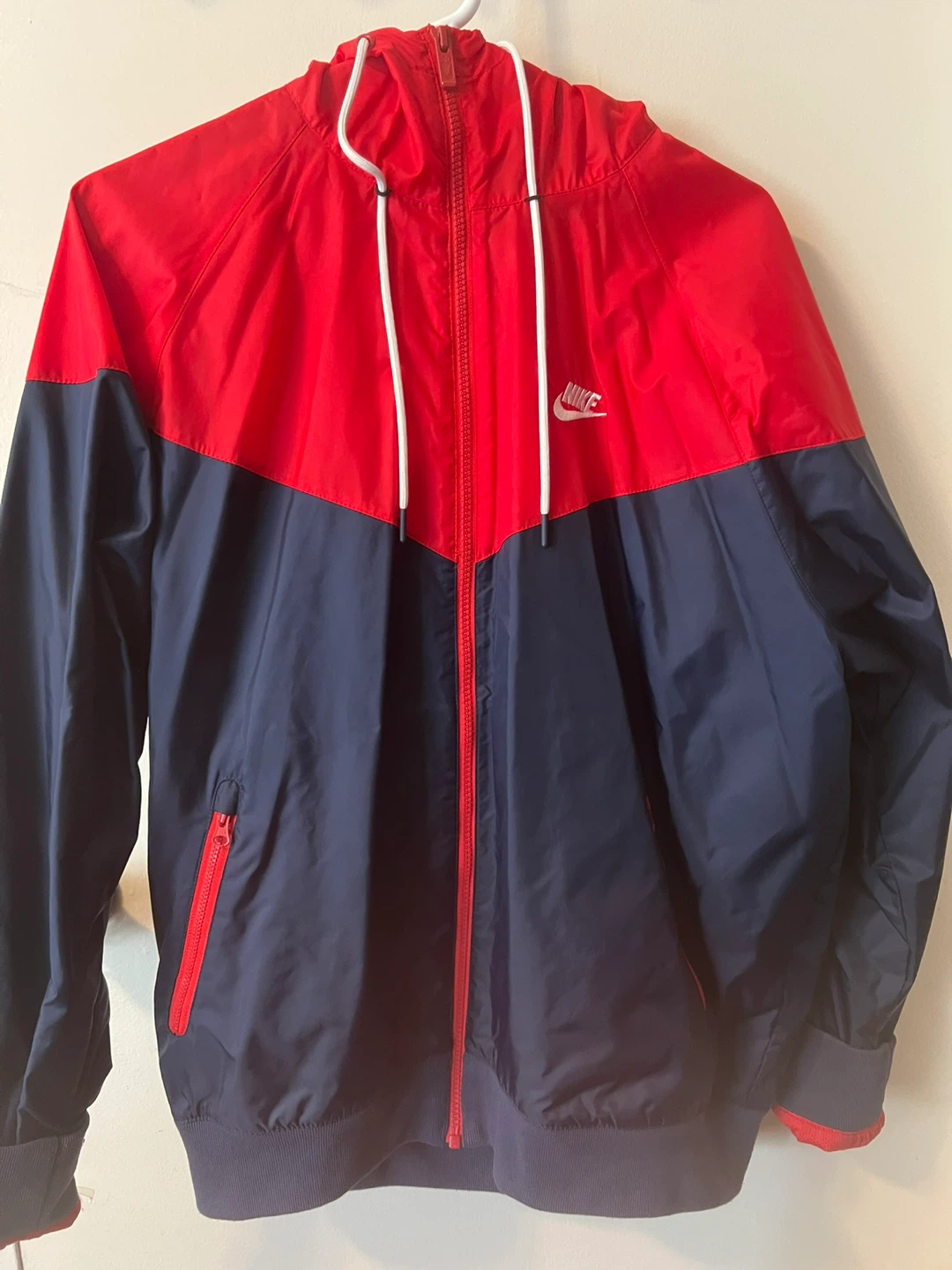 Selling a Nike Windrunner jacket in size medium. The jacket is red and navy. It's in great condition and perfect for layering or wearing on its own!