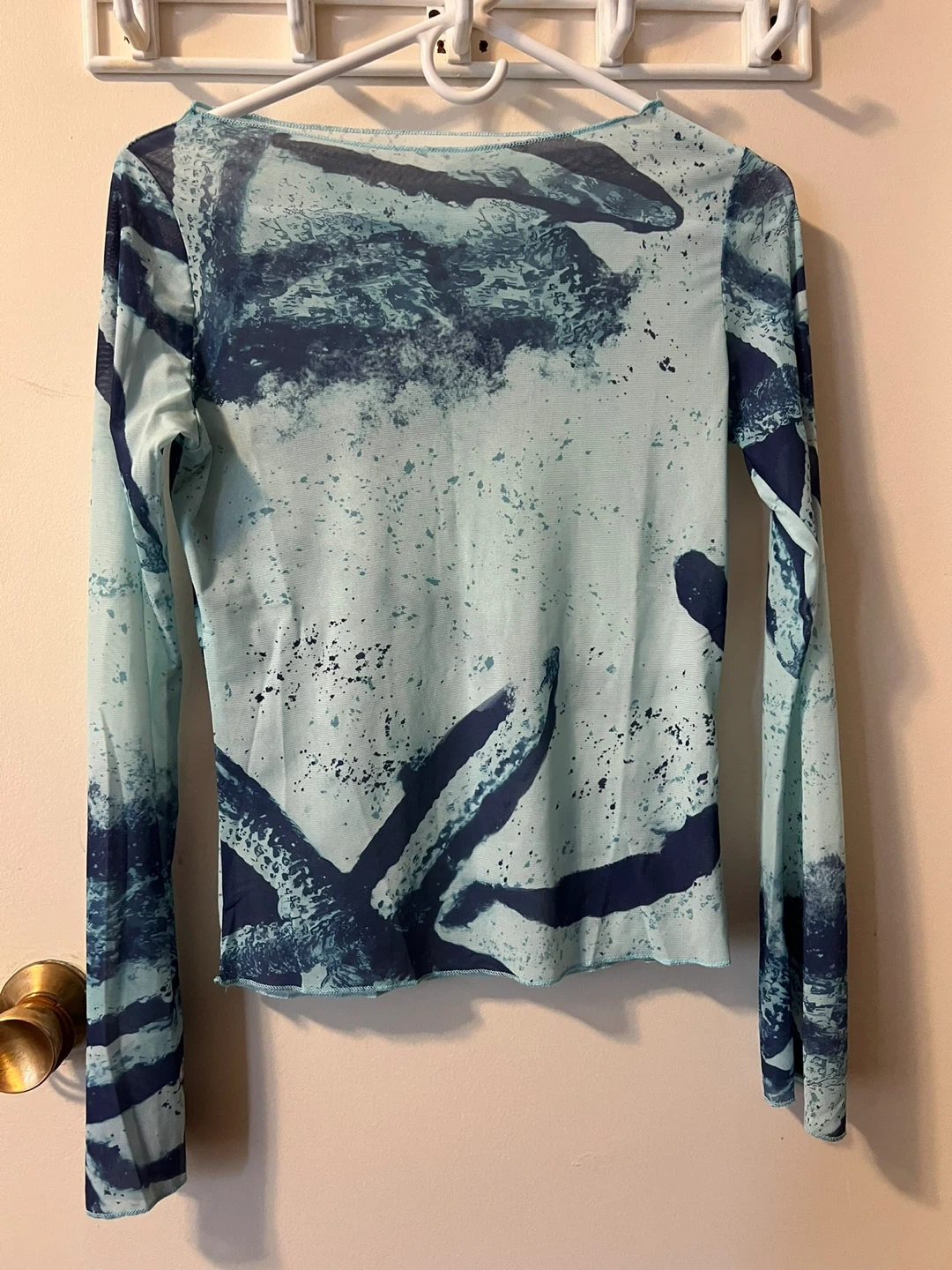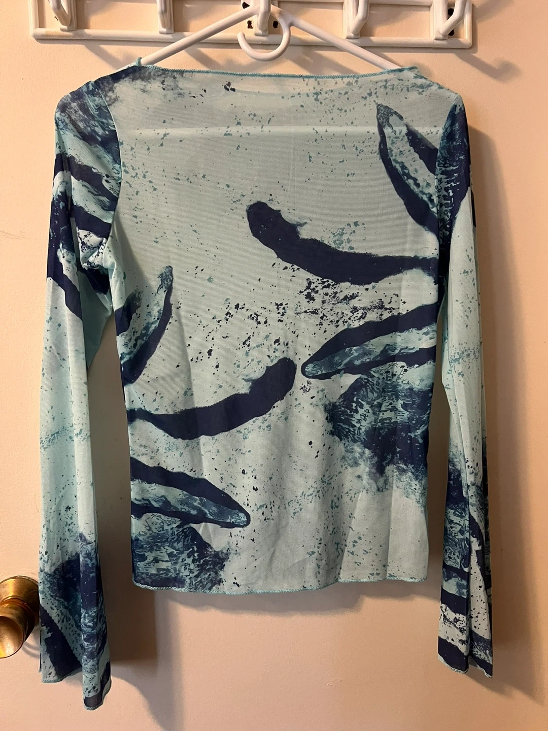 This long sleeve top features a unique blue pattern. It's in great condition and ready for a new wardrobe!