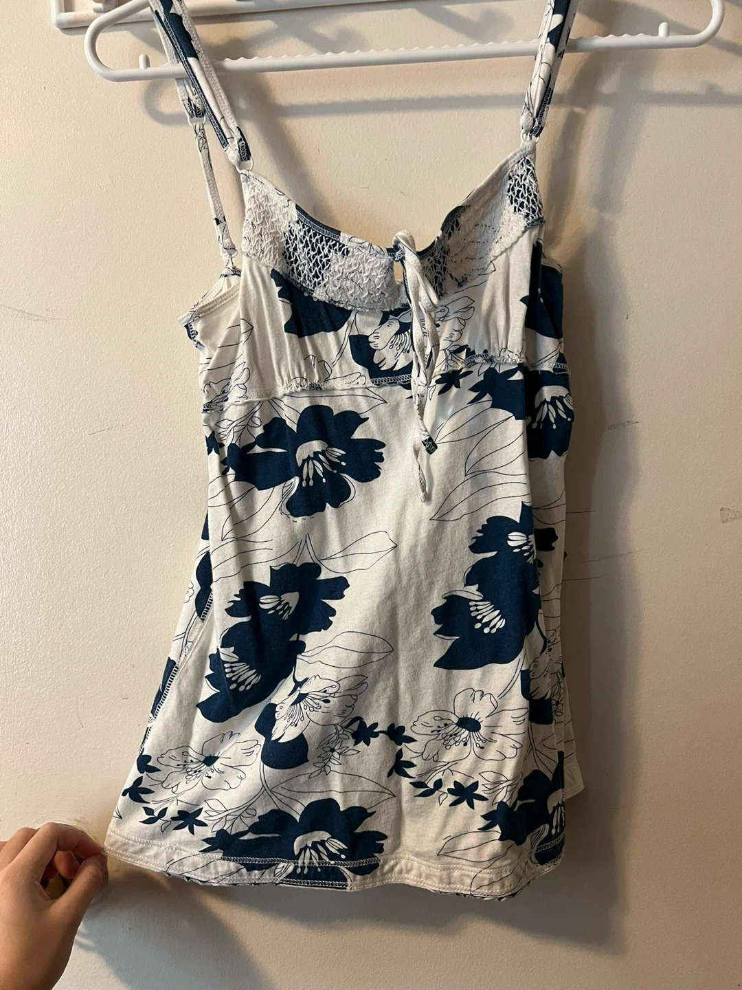 Here's a cute tank top with a floral print! It's in great condition and ready for a new owner. The design features large, dark blue flowers on a white background. Perfect for summer!
