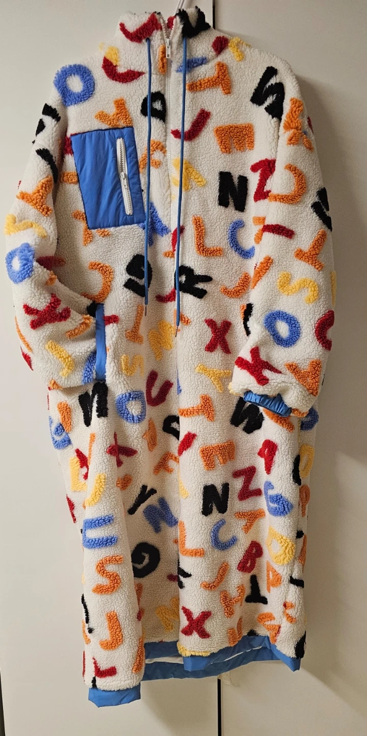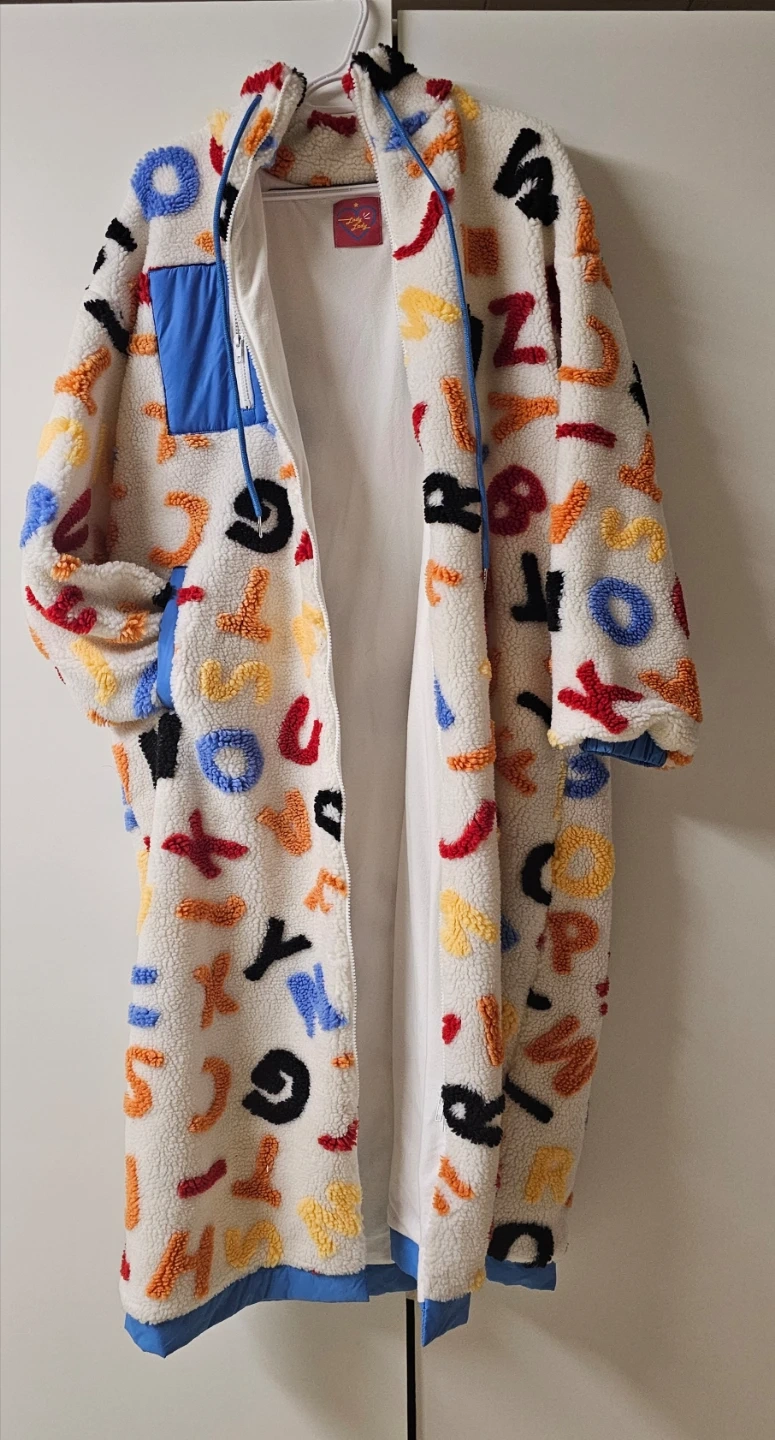 Cozy up in this eye-catching Lazy Oaf sherpa long coat! It features a fun alphabet design all over, perfect for adding a playful touch to your wardrobe. The coat is in great condition and ready to keep you warm this season. It's a unique piece that's sure to turn heads! XS~M