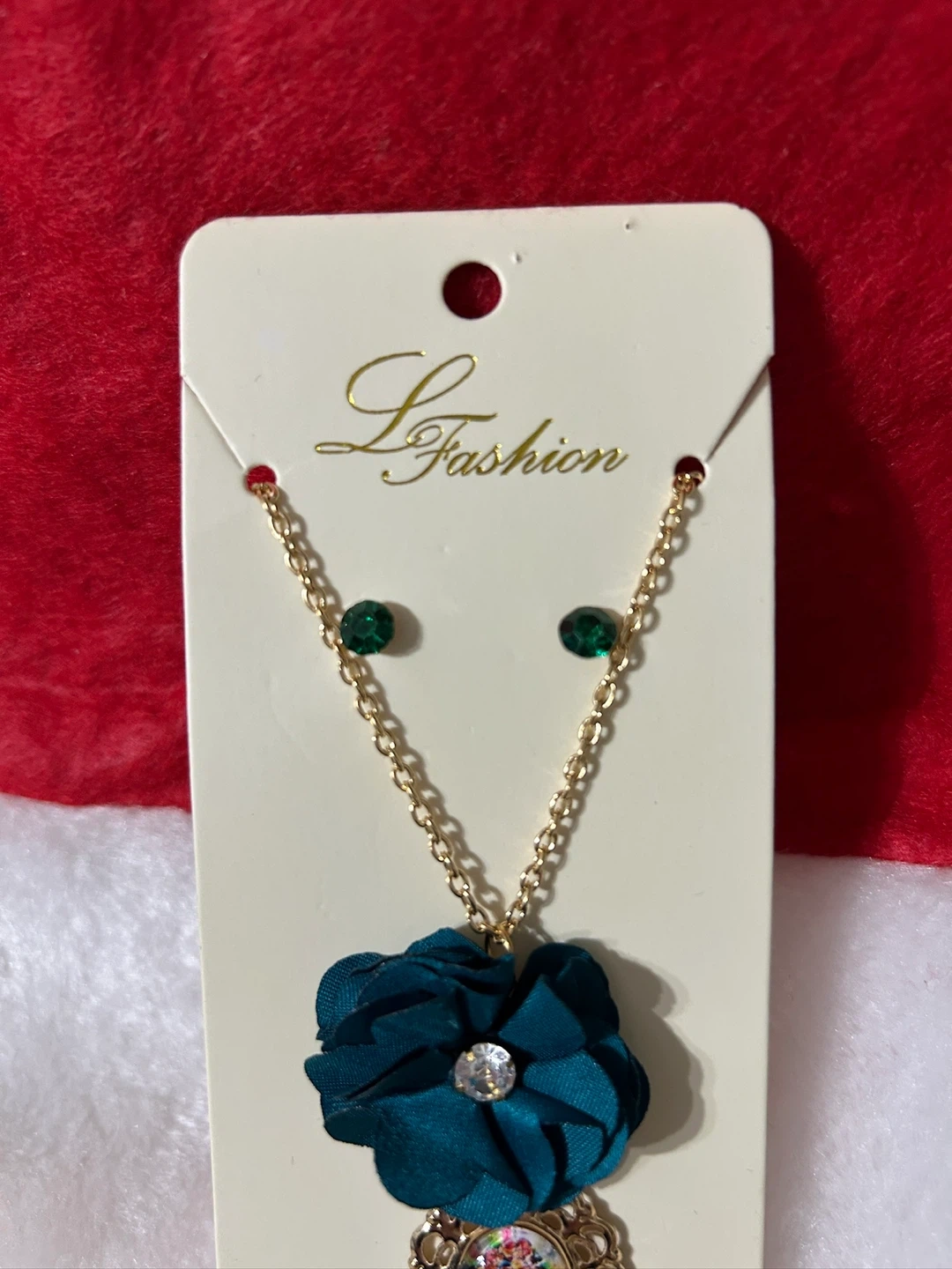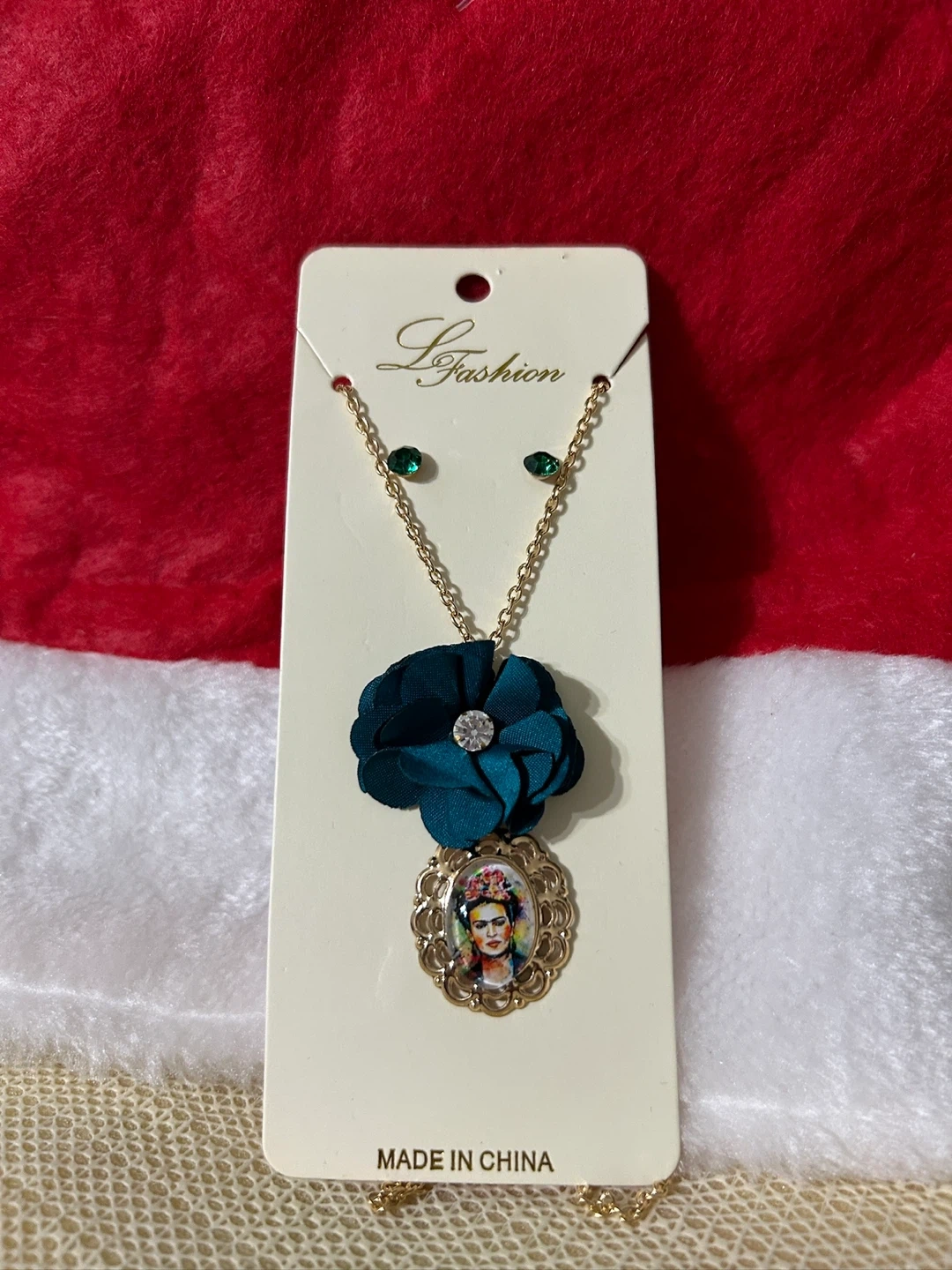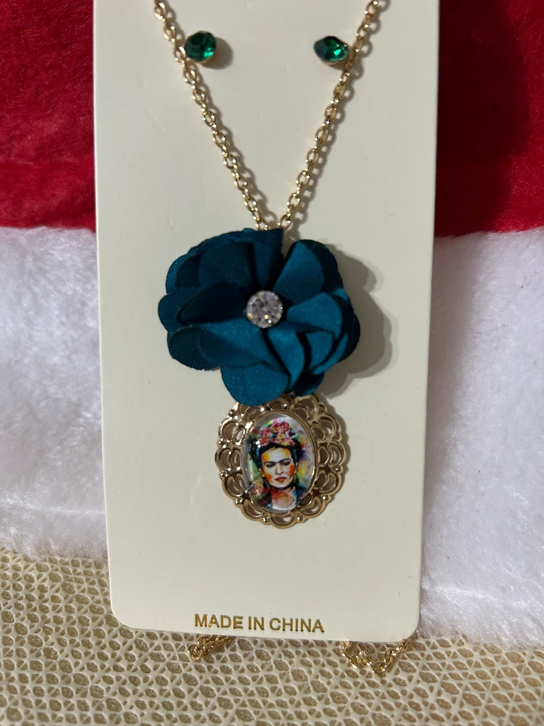 Here's a cute necklace and earrings set! It features a gold-tone chain with a teal flower and a Frida Kahlo pendant. The earrings match with small green stones.