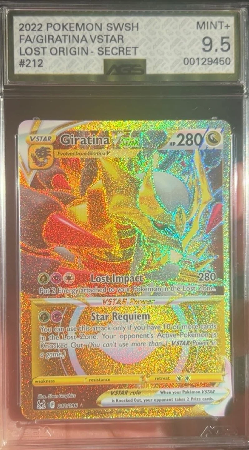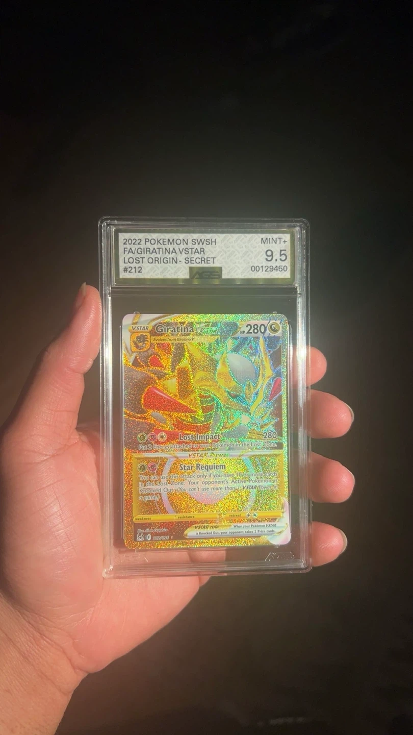 Selling a Giratina VSTAR card from the Lost Origin series. It's a secret rare, card number 212, and has been graded Mint+ 9.5 by AGS. A great addition to any Pokemon card collection!