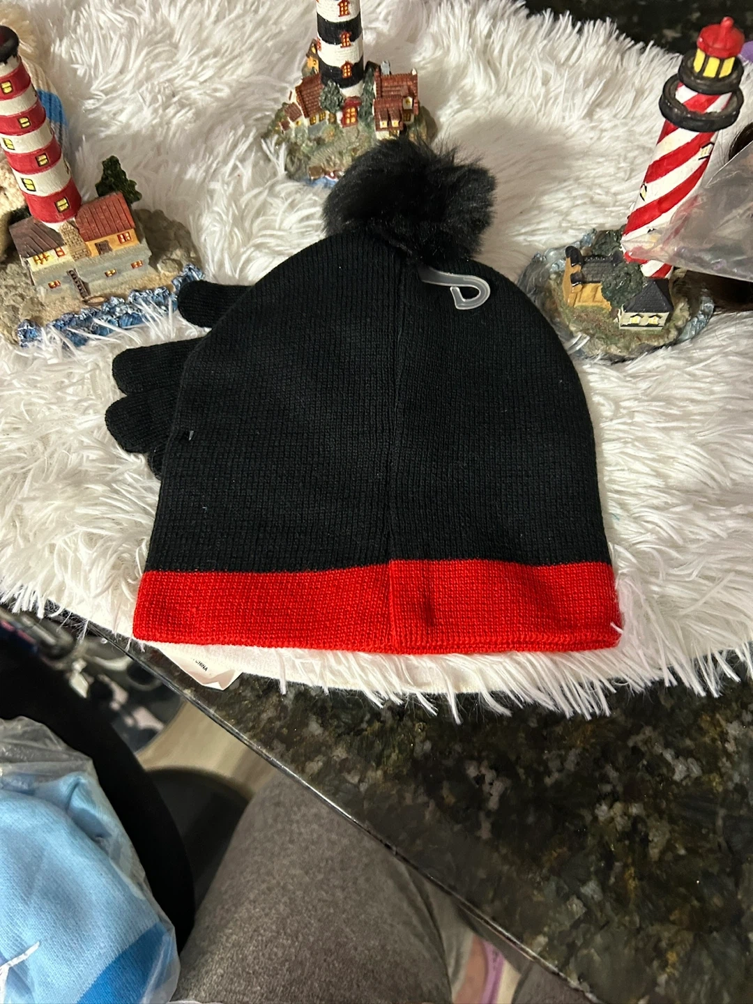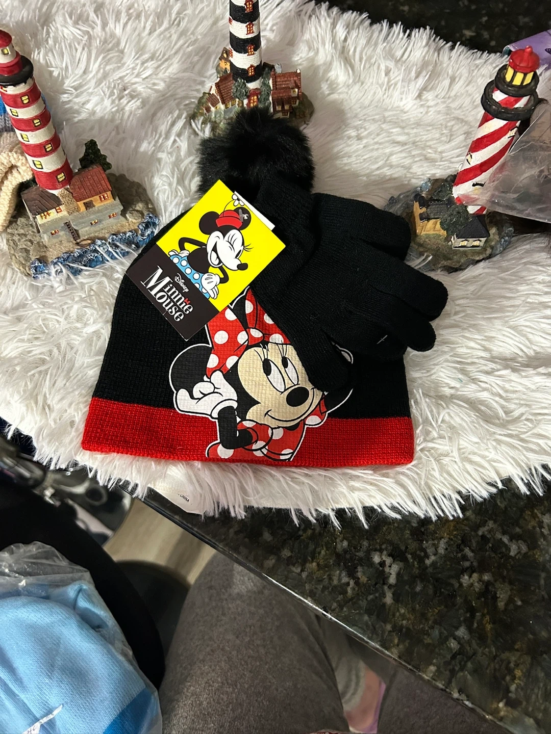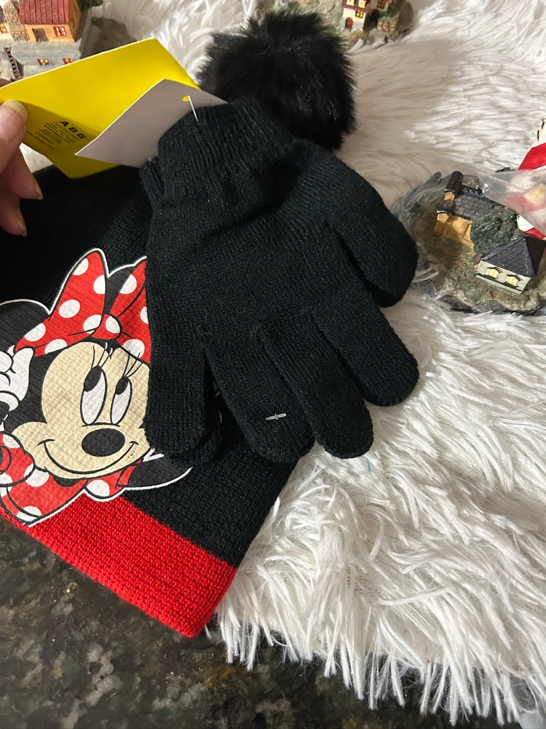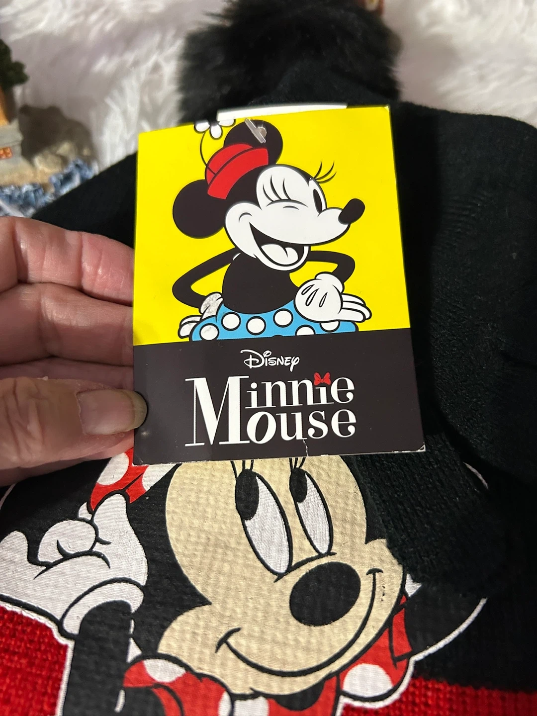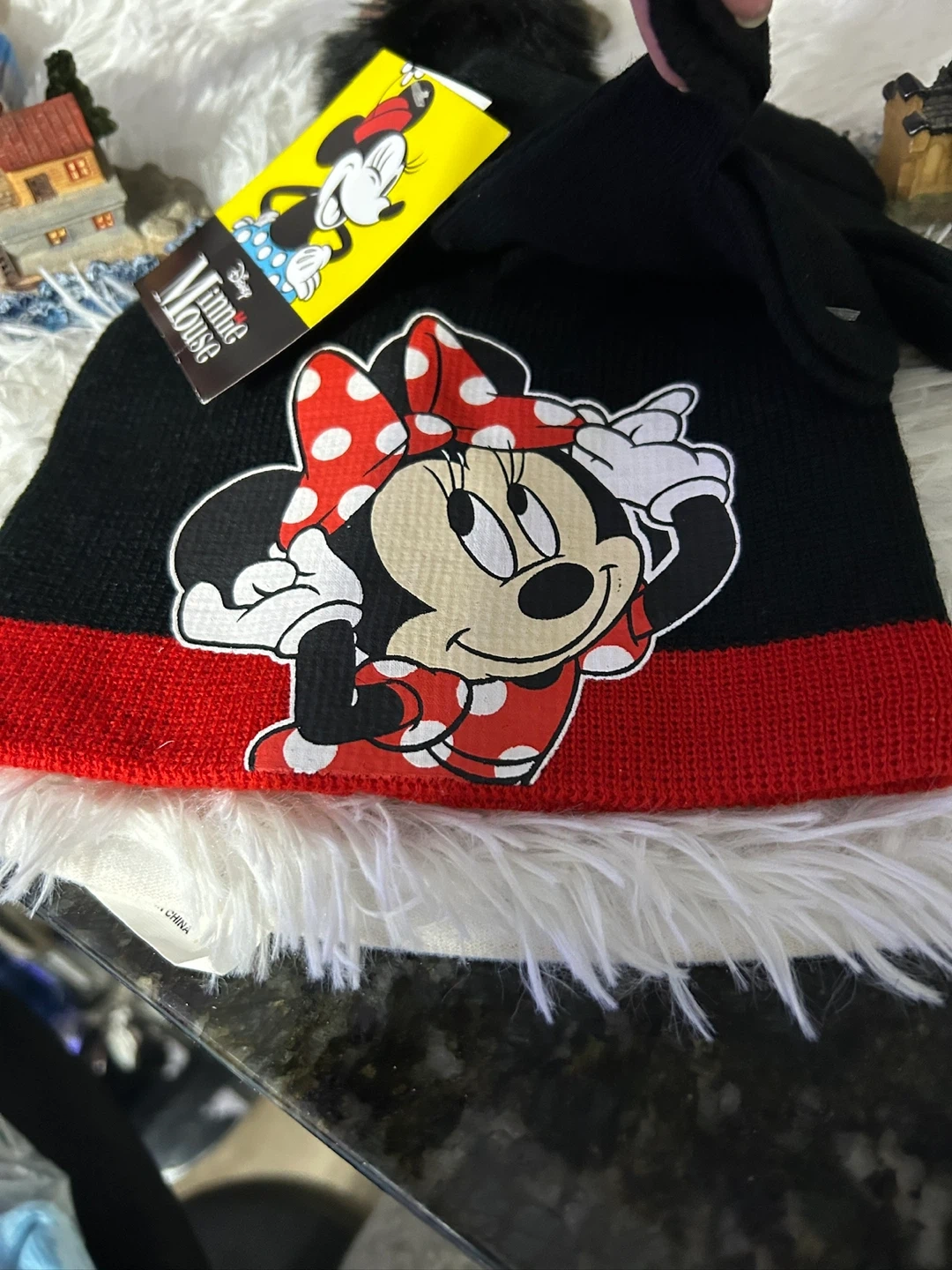 This is a brand new Disney Minnie Mouse hat and glove set! The hat is black with a red trim and a Minnie Mouse design. The gloves are black. Perfect for keeping warm and showing off your love for Minnie!