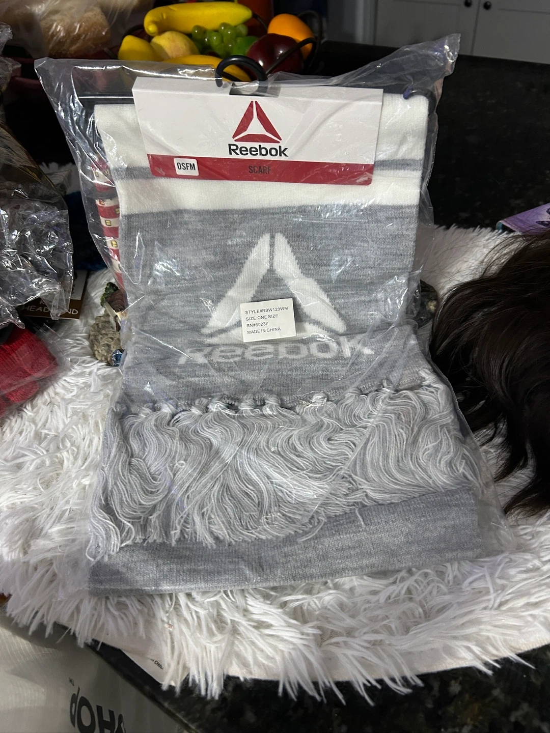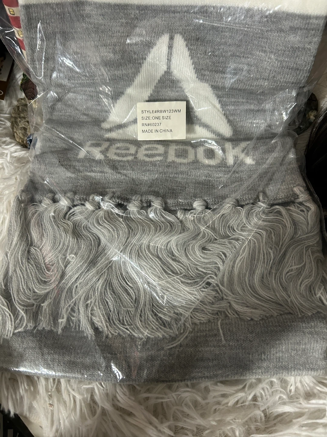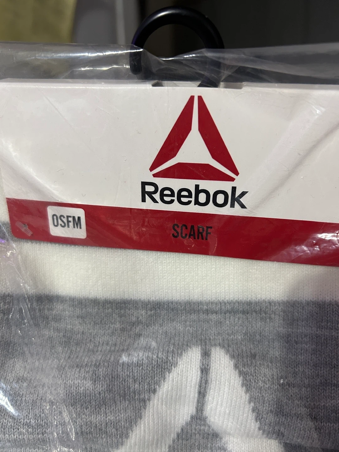 For men Selling a brand new Reebok scarf, still in its original packaging! The scarf is light gray and one size fits most (OSFM). Perfect for keeping warm and stylish!