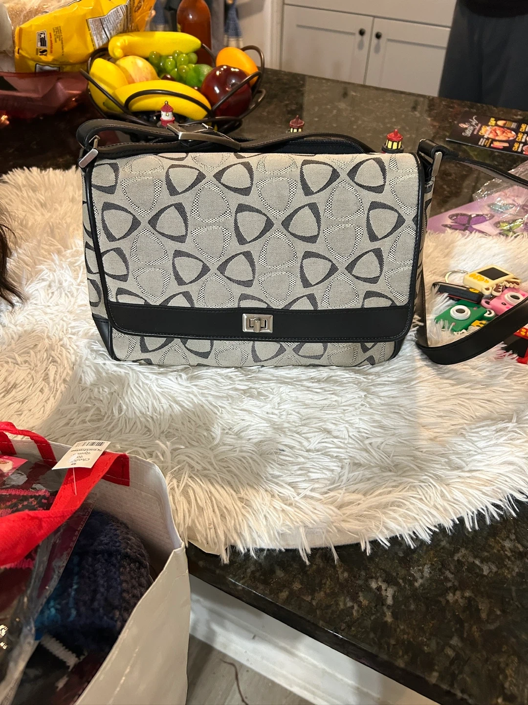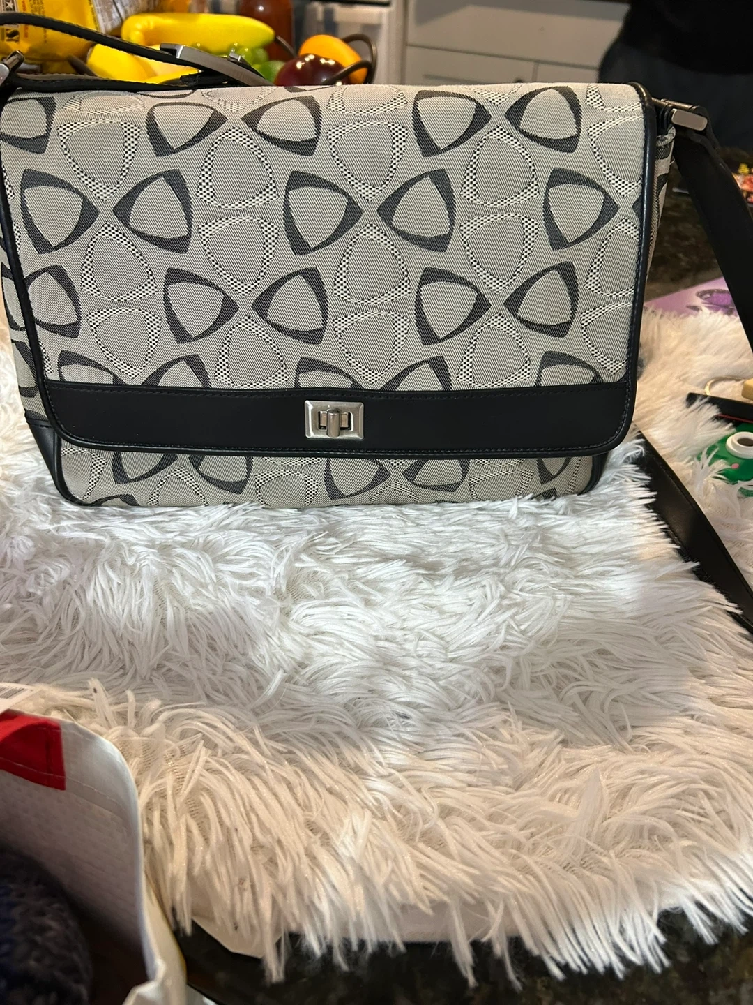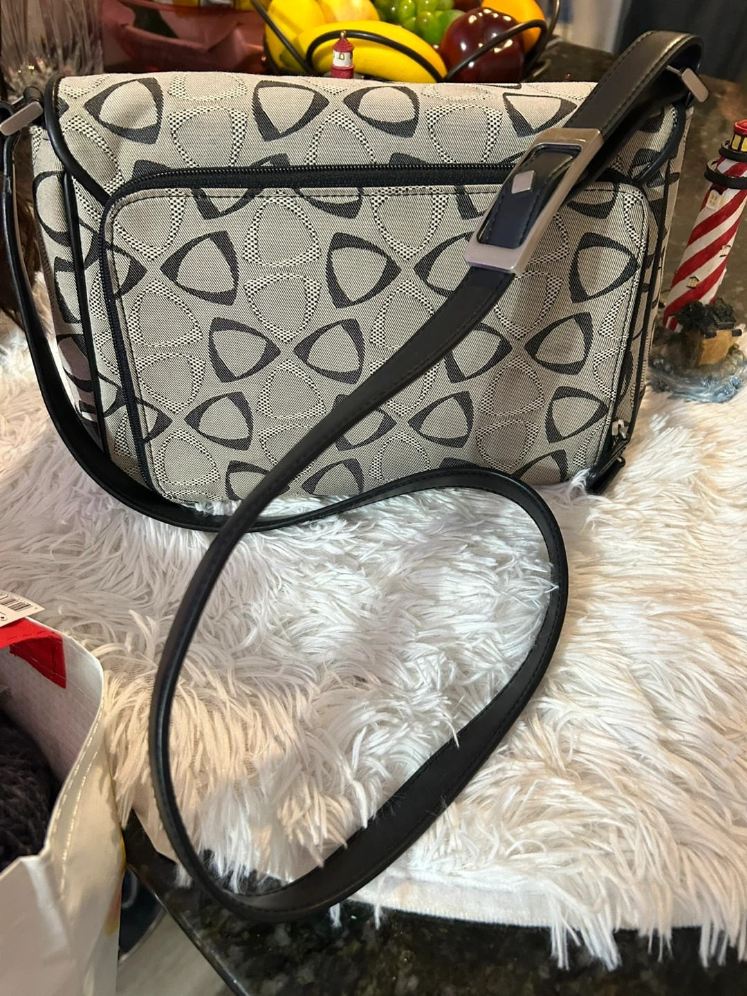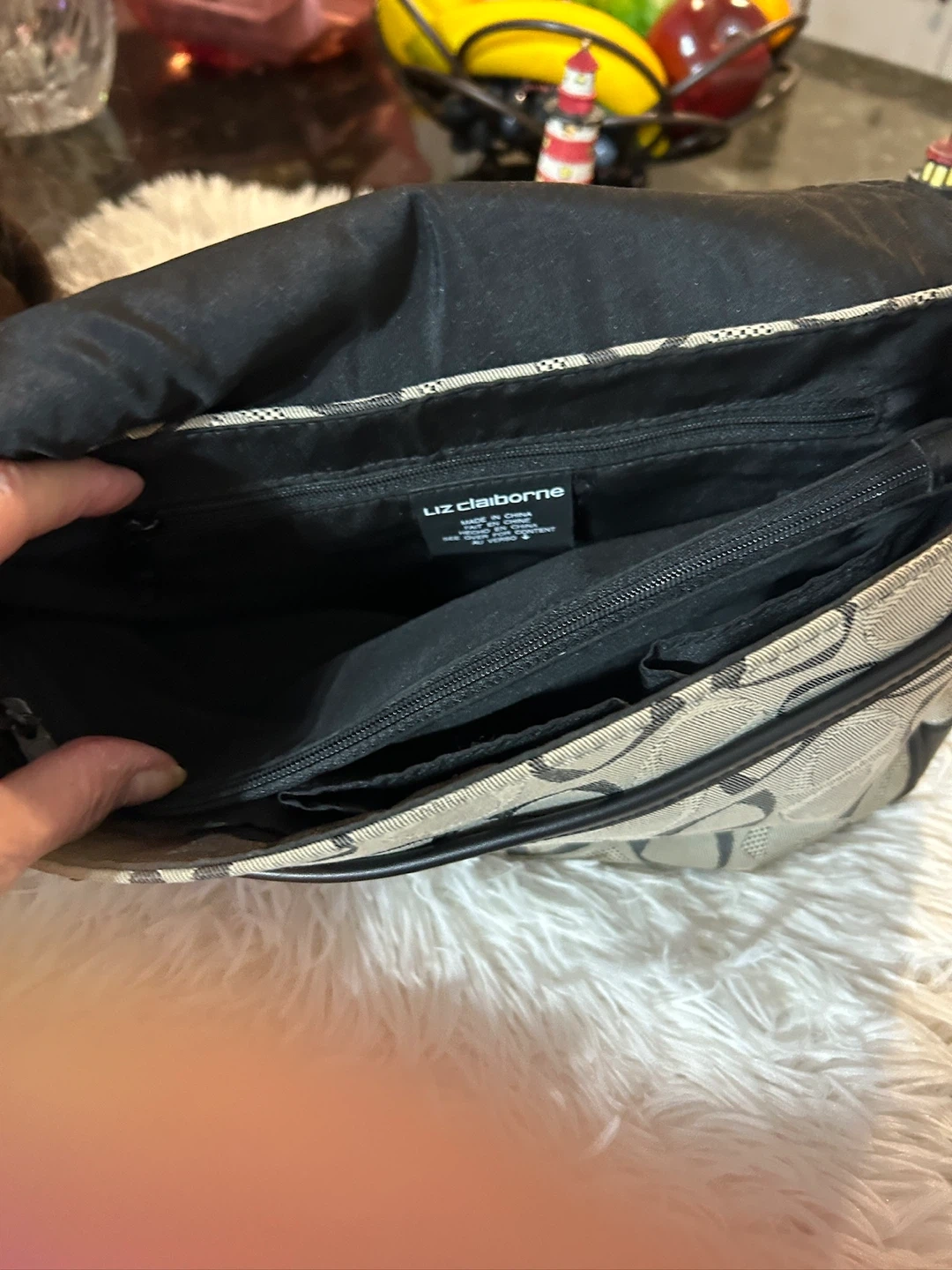 This is a Liz Claiborne shoulder bag. It has a unique pattern and a black shoulder strap. It's in great condition and ready for a new owner!