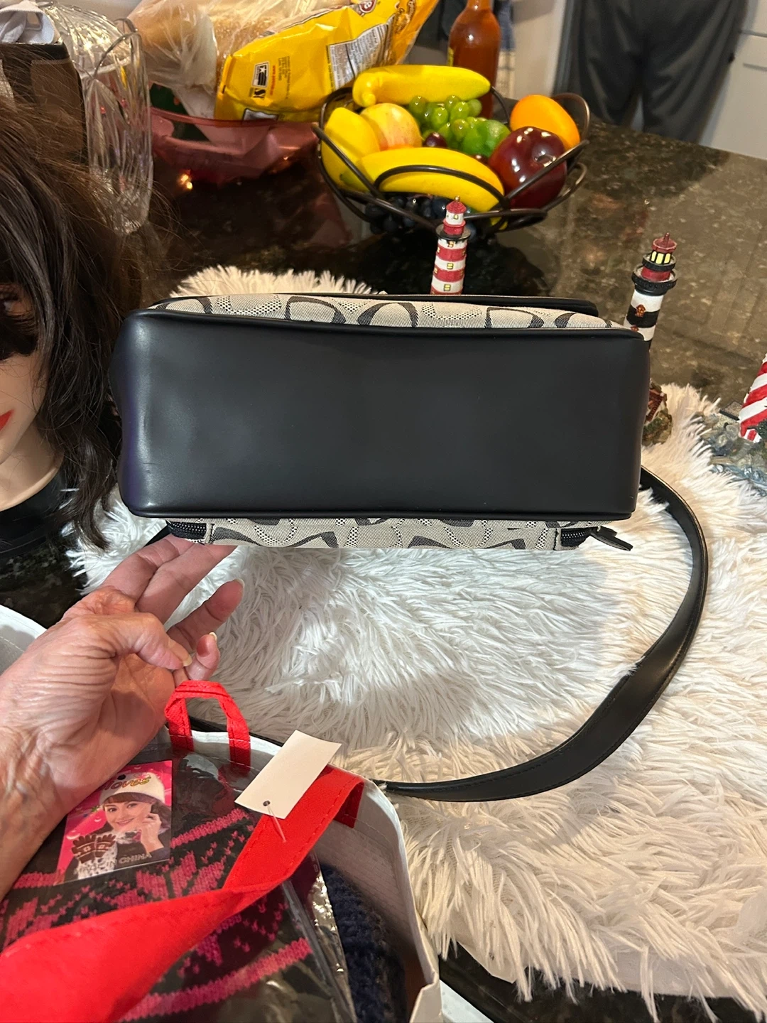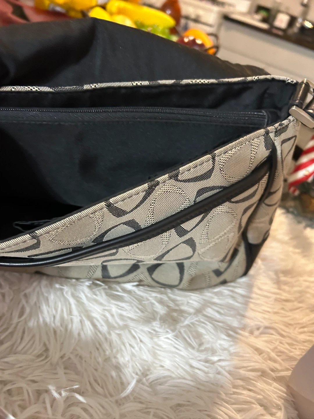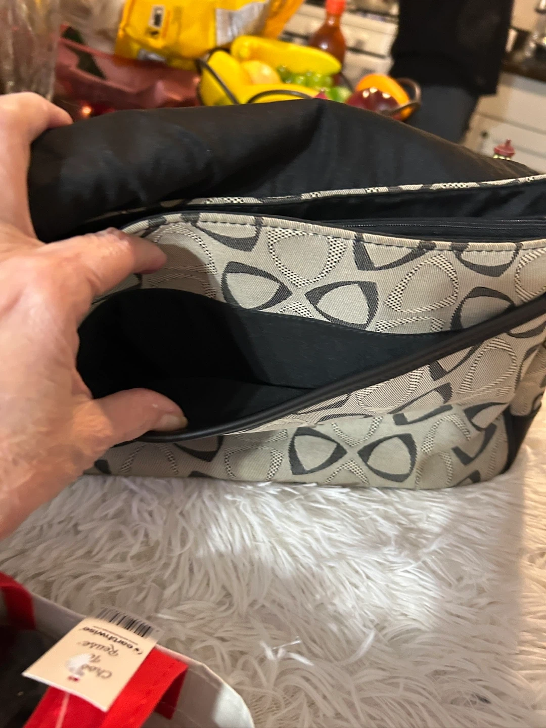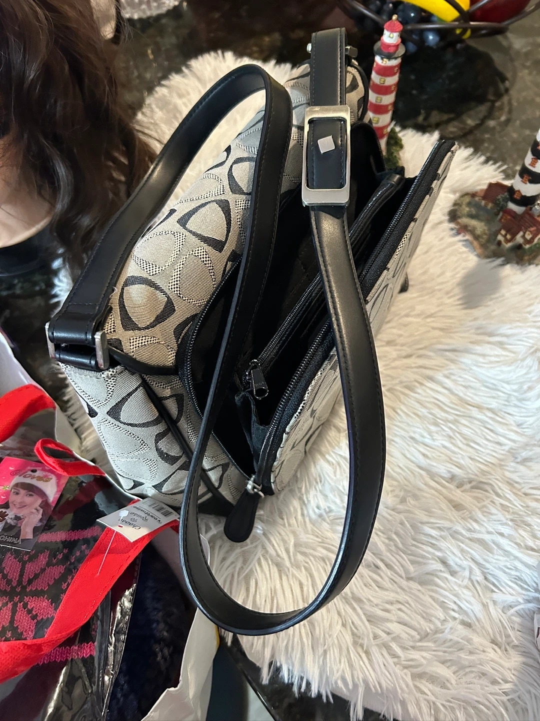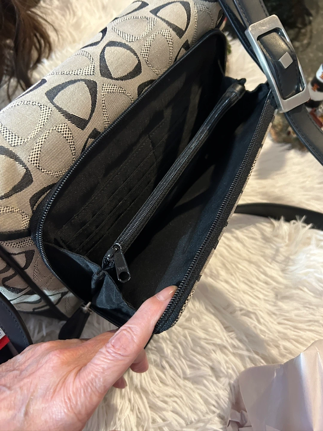 This is a Liz Claiborne shoulder bag. It has a unique pattern and a black shoulder strap. It's in great condition and ready for a new owner!