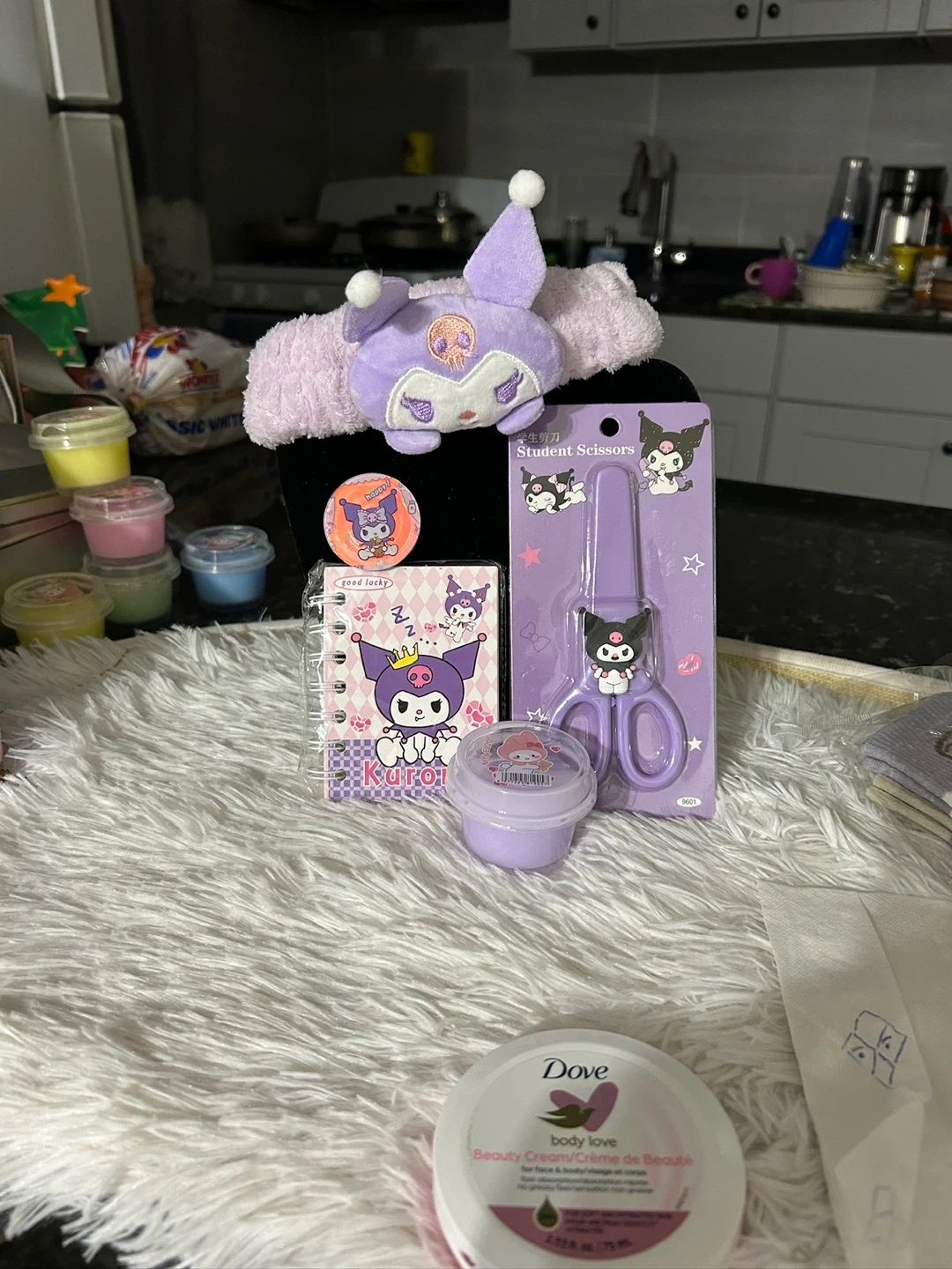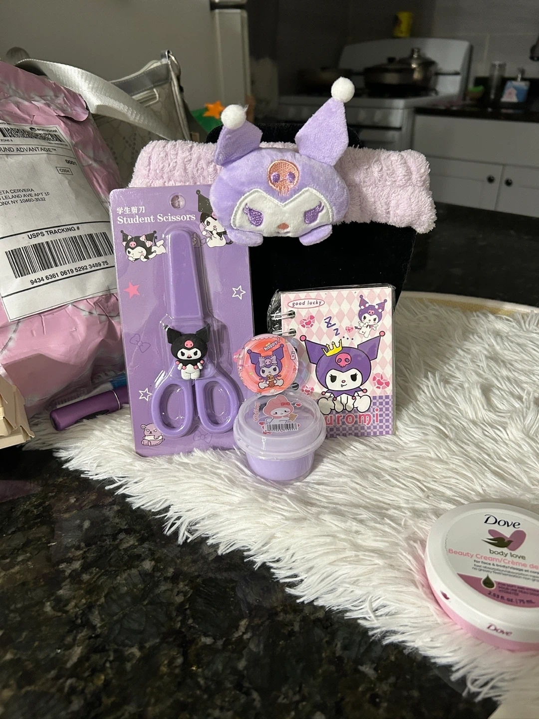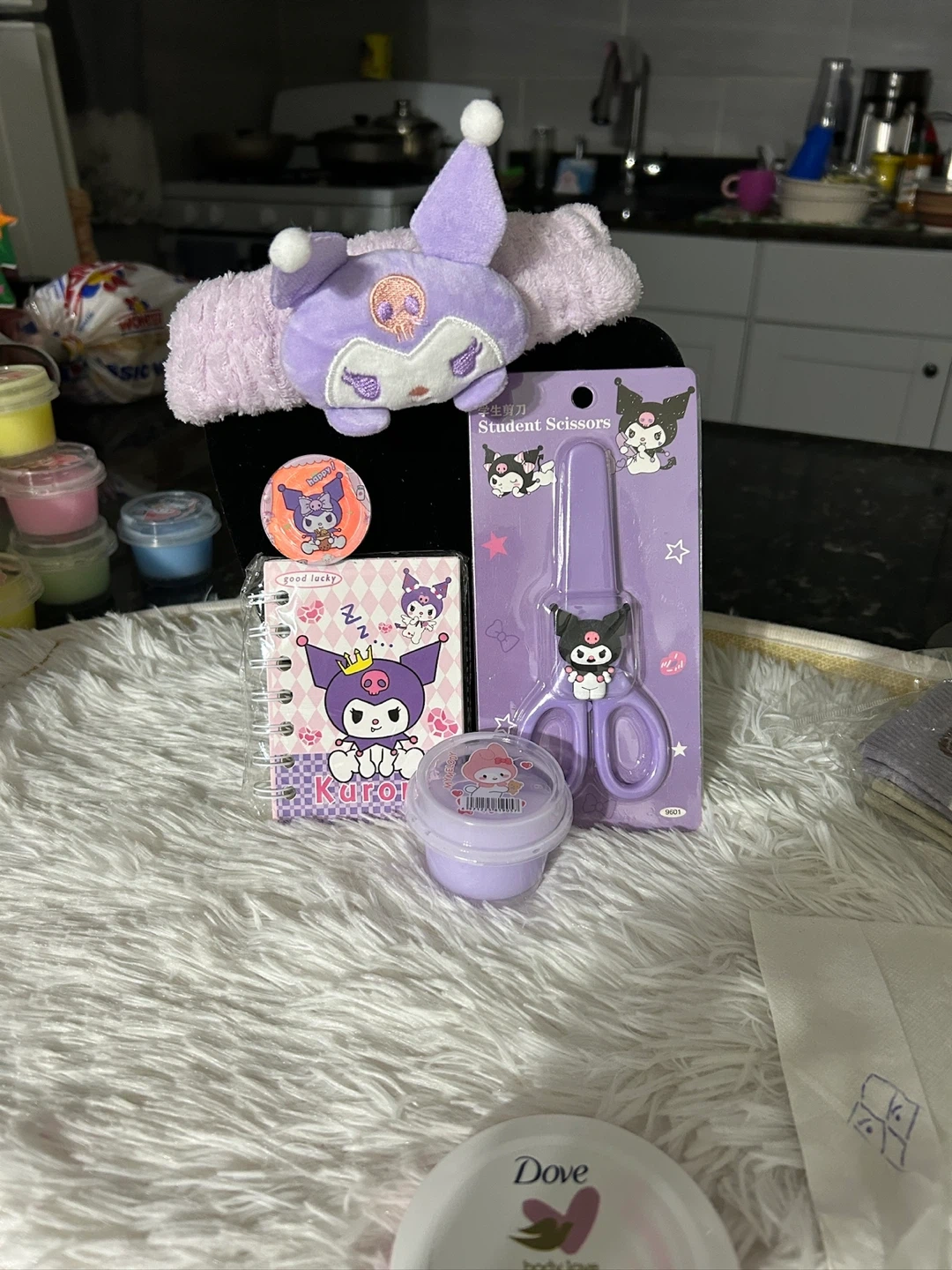 Selling a brand new Kuromi stationery set! This cute set includes a notebook, scissors, a plushie, and other adorable accessories. Perfect for any Kuromi fan!