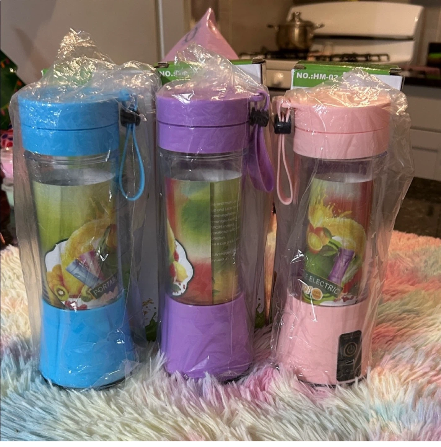 I have a new portable electric juicer blender. It's perfect for making juices and smoothies with fruits and vegetables. It's lightweight and portable, so you can take it with you wherever you go! It comes in pink, blue, and purple.