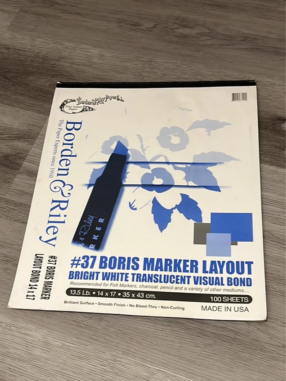 Selling a Borden & Riley #37 Boris Marker Layout pad. It's a bright white, translucent visual bond paper, great for felt tip markers, charcoal, pencil, and other mediums. The pad is 14 x 17 inches (35 x 43 cm) and contains 100 sheets. Eliminates bleed through and feathering. Originally bought for $35.99 plus HST.