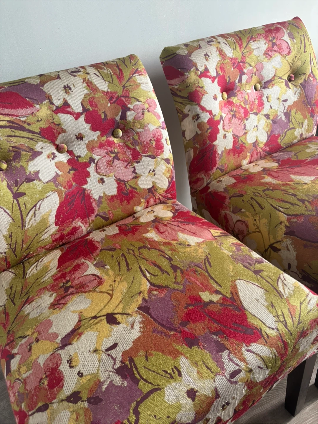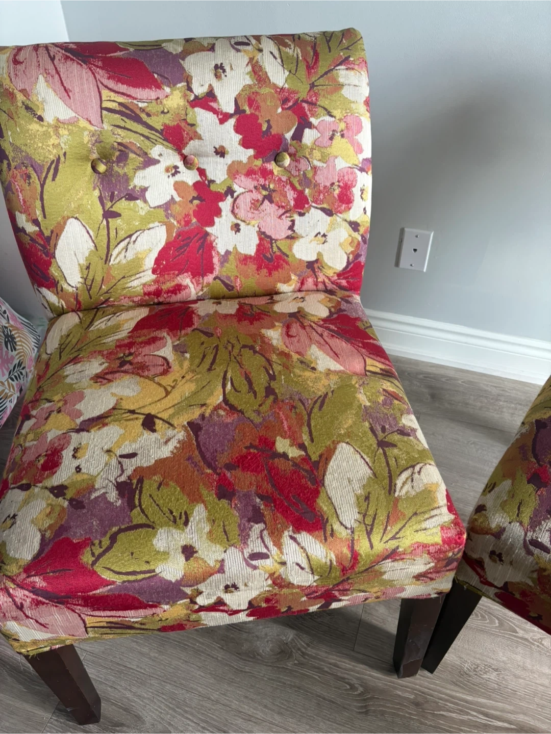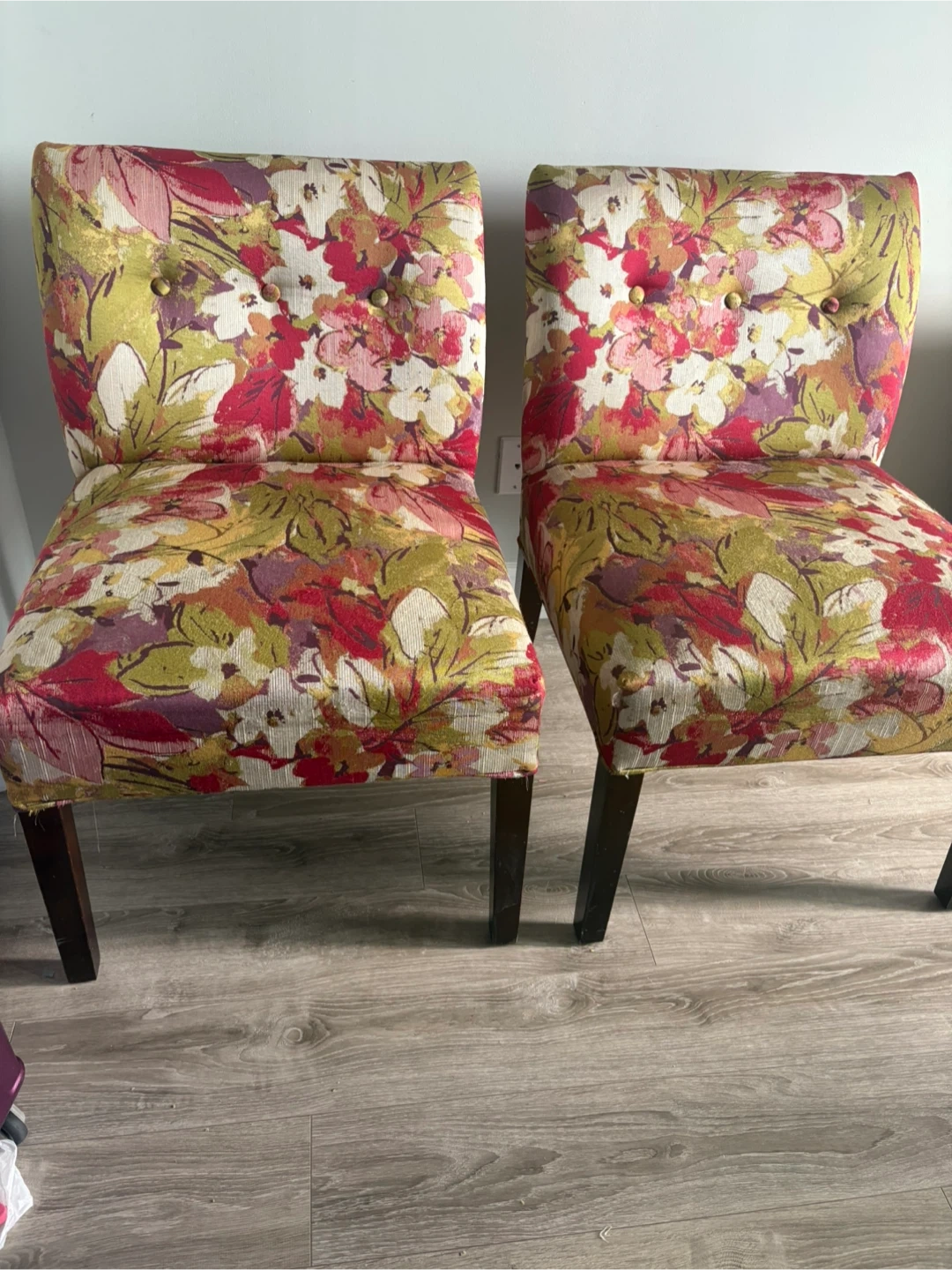 Selling a set of two accent chairs with a lovely floral pattern. They're in good condition and would add a pop of colour to any room. Perfect for a living room or bedroom!