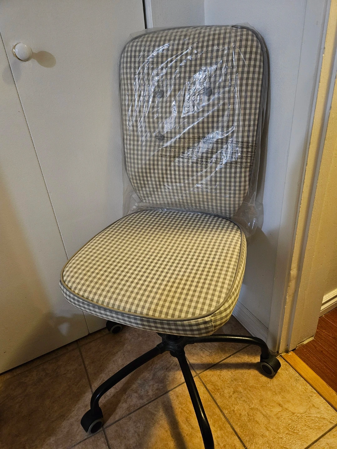 Selling a comfy office chair featuring a cute gingham pattern! It's in great shape and ready for a new workspace or home office.