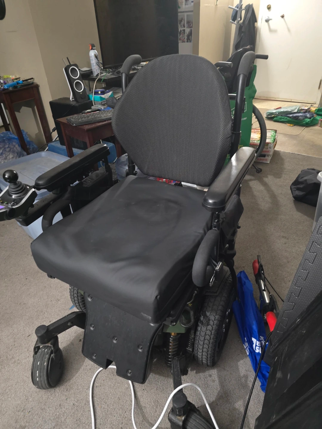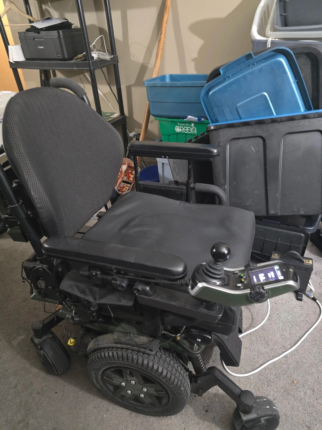 Selling a Quantum Rehab Matrix power wheelchair in good condition. The chair has a black seat and back, and it is currently set to 'Indoor' and 'Slow' mode. The battery is at 100%.
