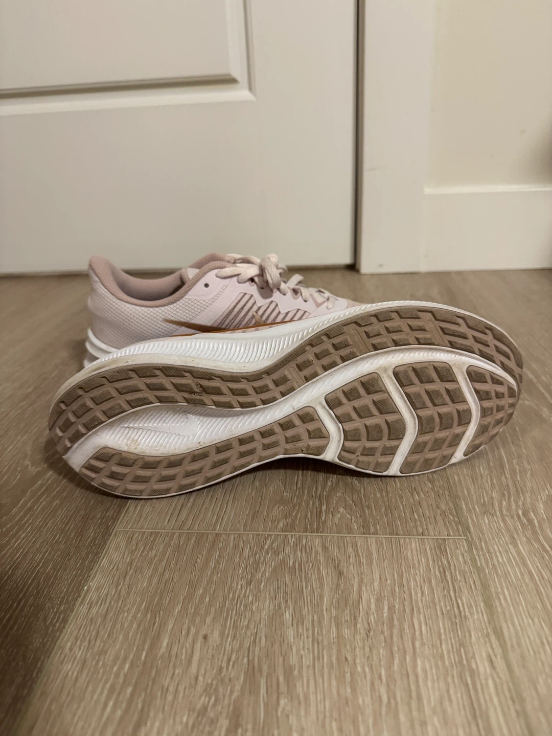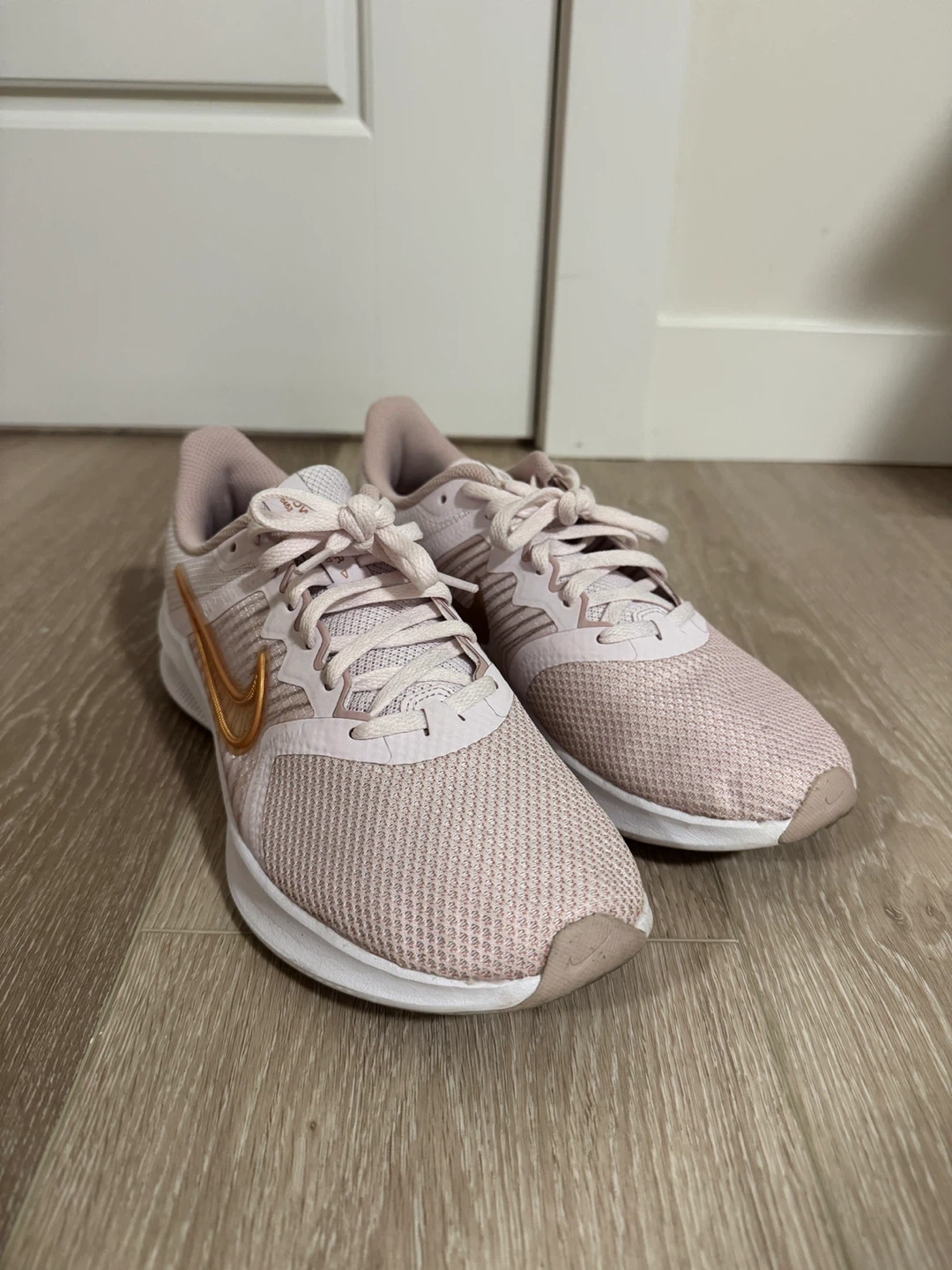 Selling a pair of Nike Downshifter 11 women's running shoes. They are in good condition and ready for your next run! The shoes are a light pink colour with a bronze swoosh.