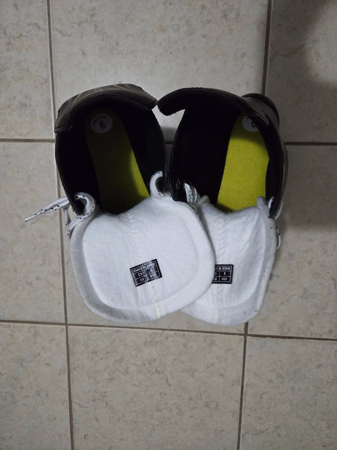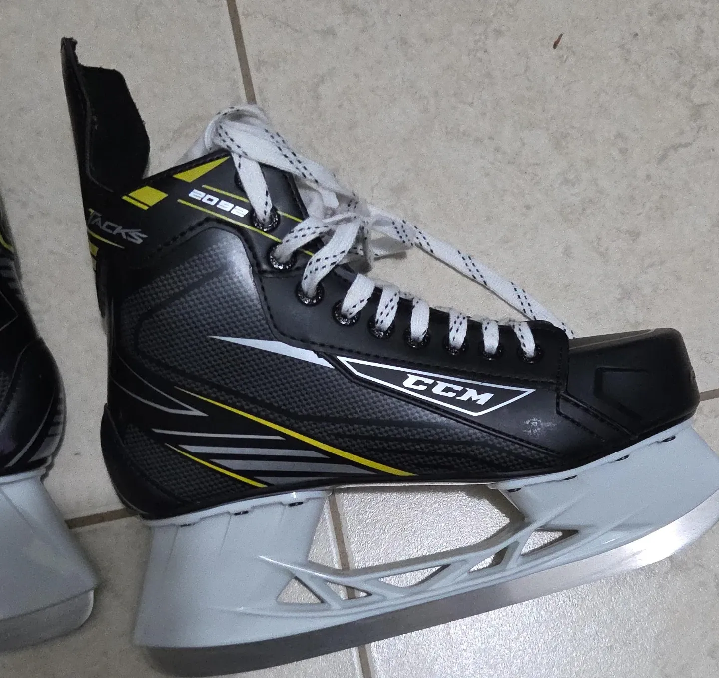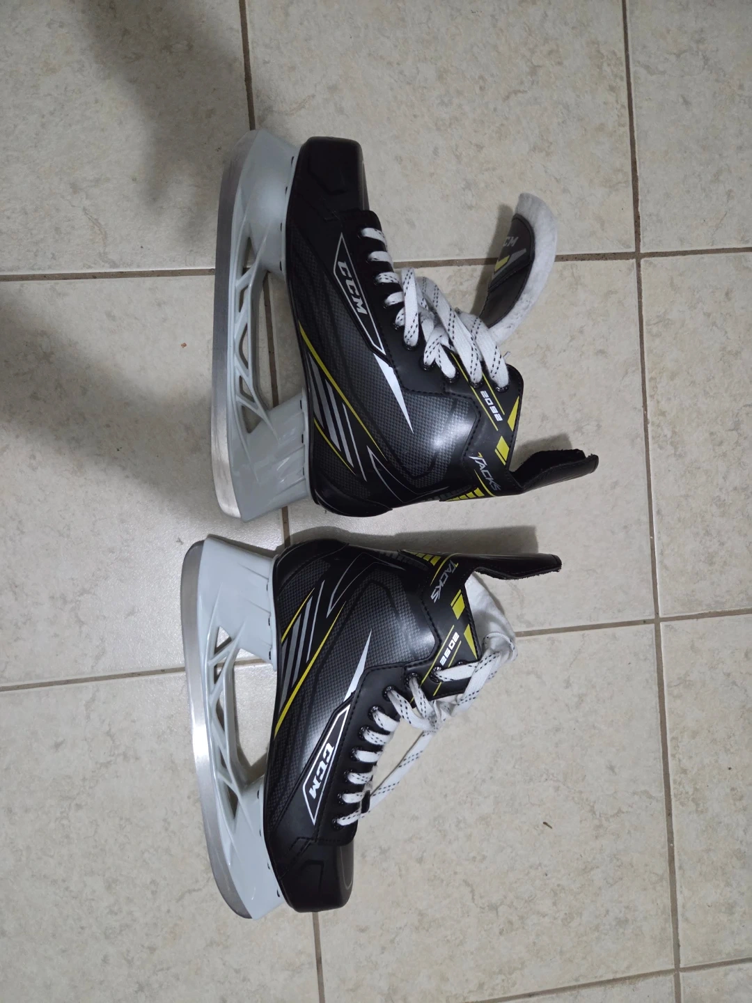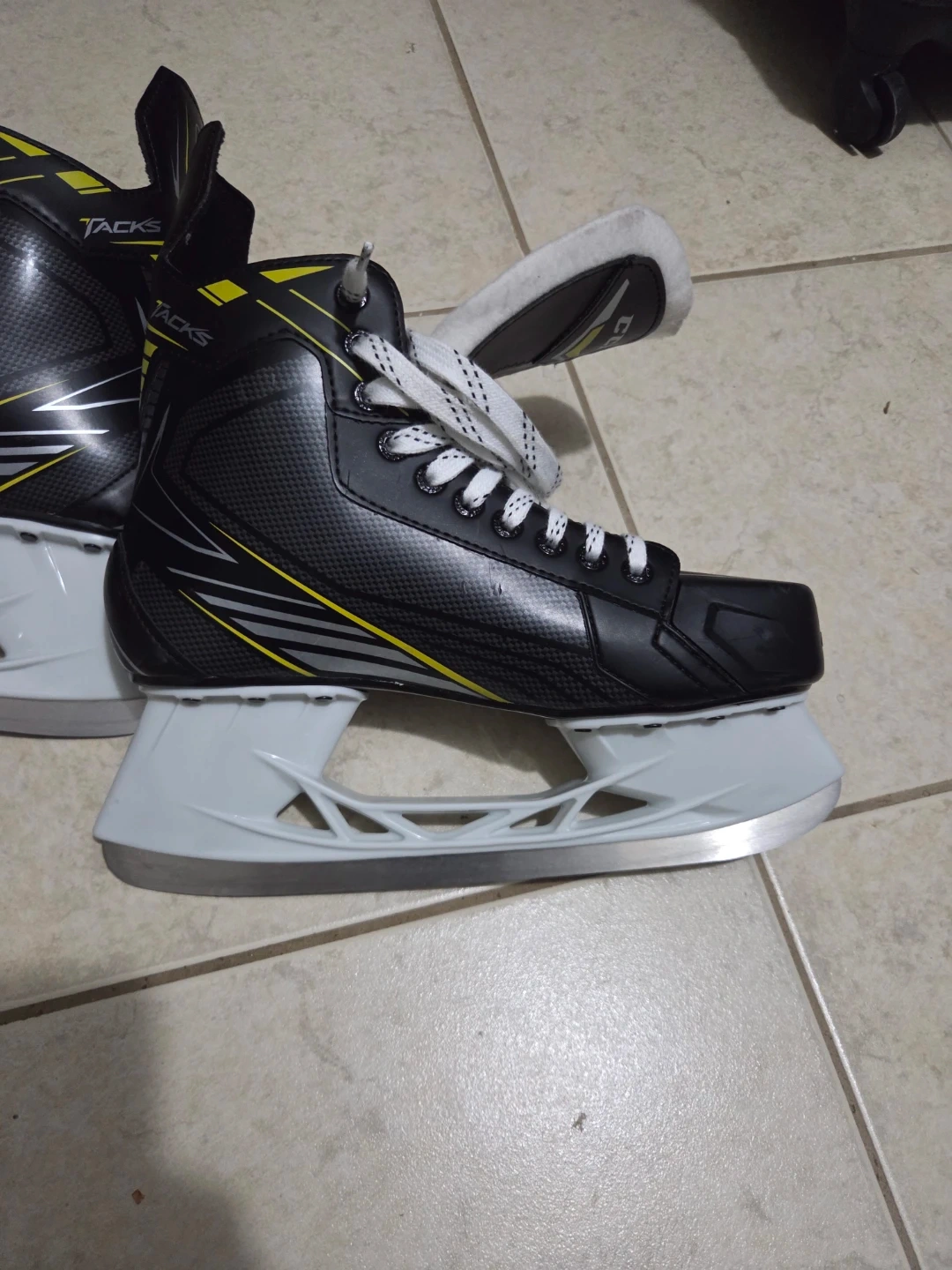 Selling a pair of CCM Tacks ice hockey skates. They are black with white and yellow accents. The size is US 9. Perfect for hitting the ice! Excellent condition.
