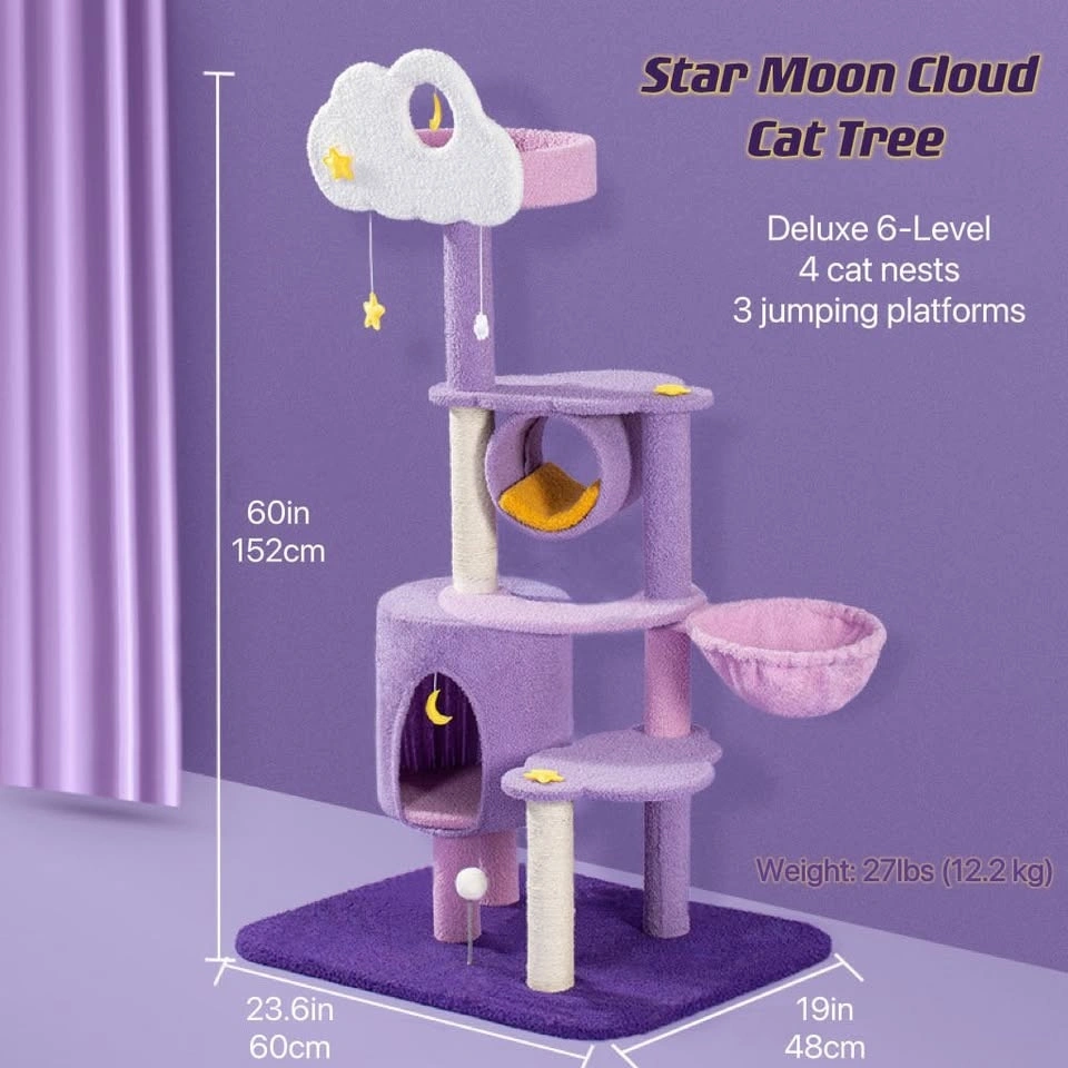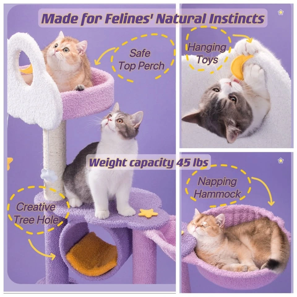 brand new 60 Inches Cat Tree for Indoor Cats, Multi-Level Cat Tower for Large Cats Cute Purple Pink Cat Tree Unique Cat Condo with Scratching Post Hammock Condo Pompom Ball Toy