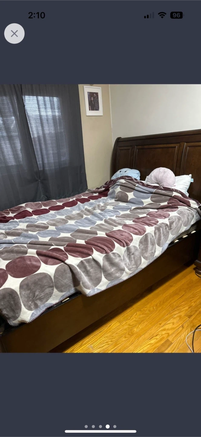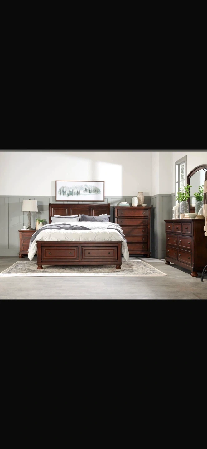 Selling a bedroom set that includes a bed frame, dresser, nightstand, and chest of drawers. All pieces are in good condition and have a matching dark wood finish. Perfect for furnishing a bedroom with a classic and elegant look!