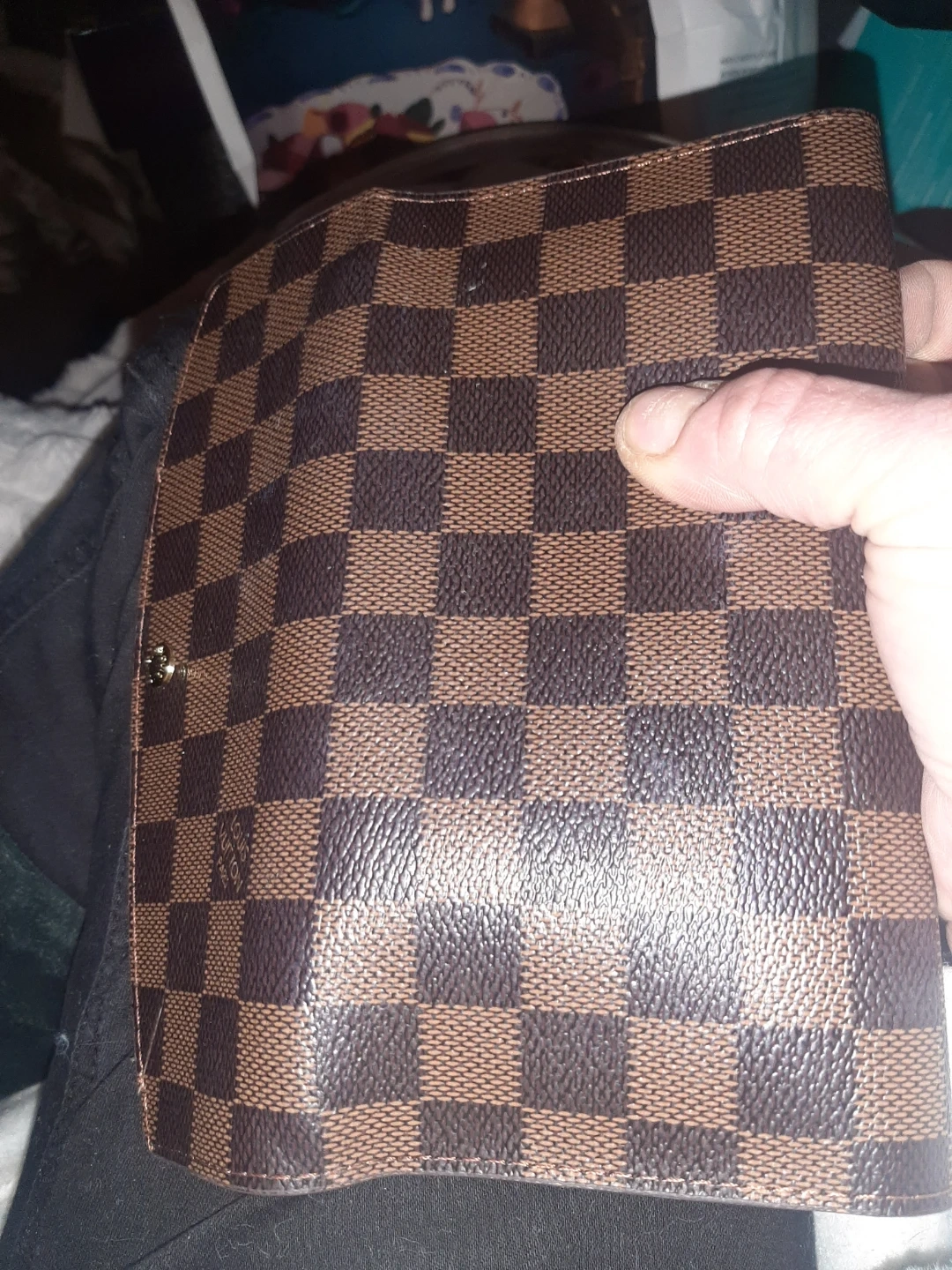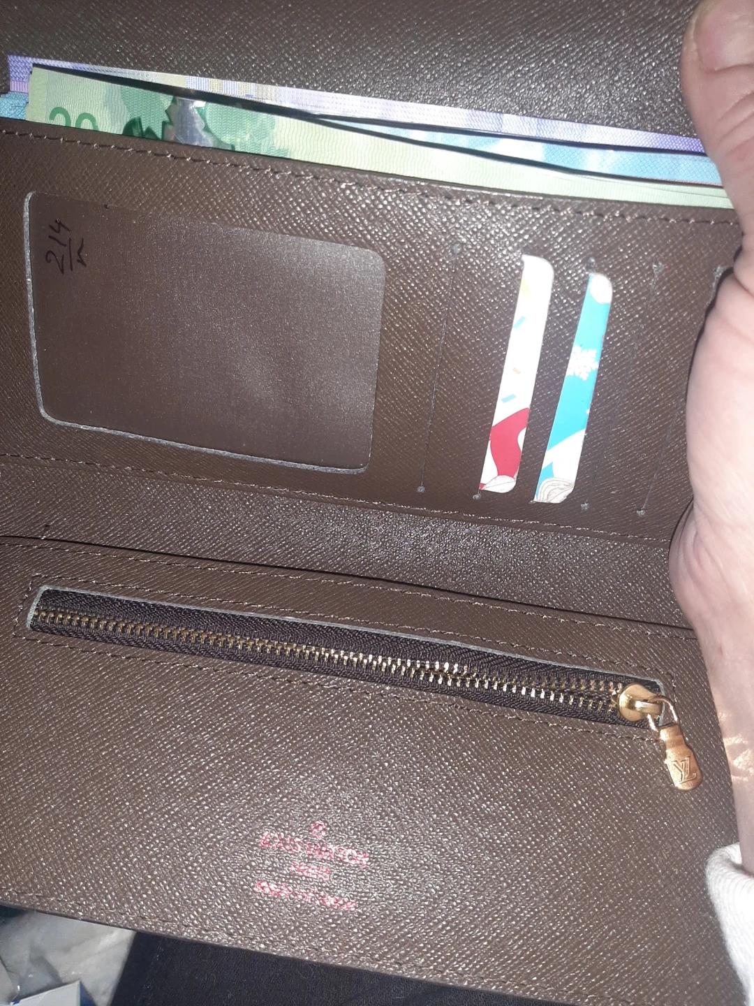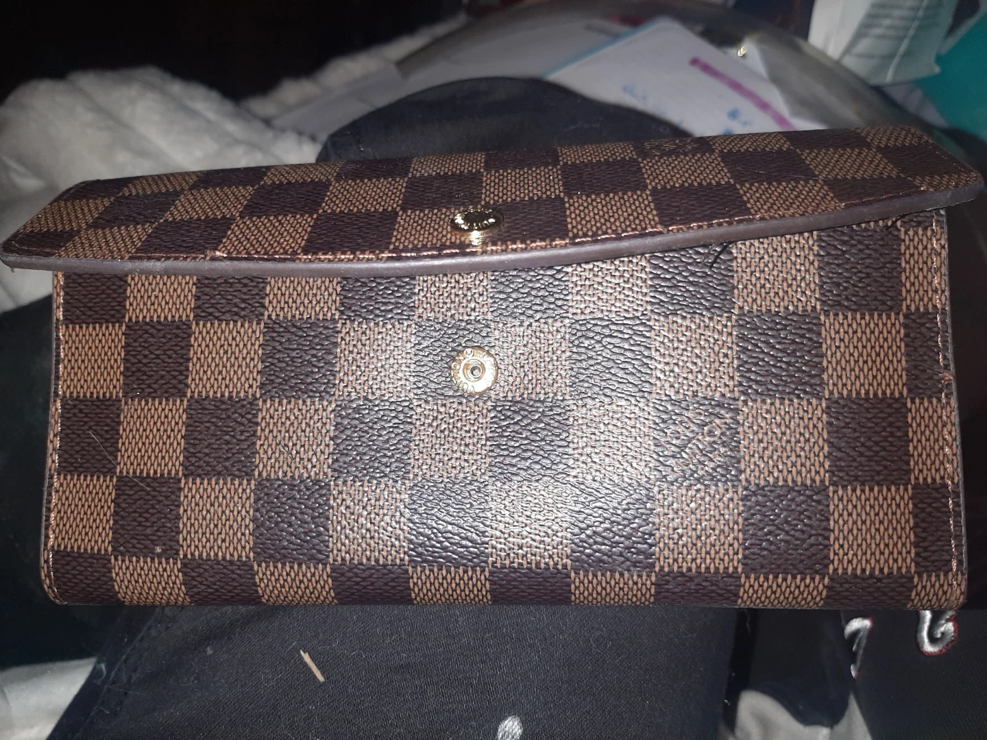 Selling a Louis Vuitton wallet in the Damier Ebene pattern. It has a snap closure and a zippered compartment inside. It's in good condition and ready for a new owner!