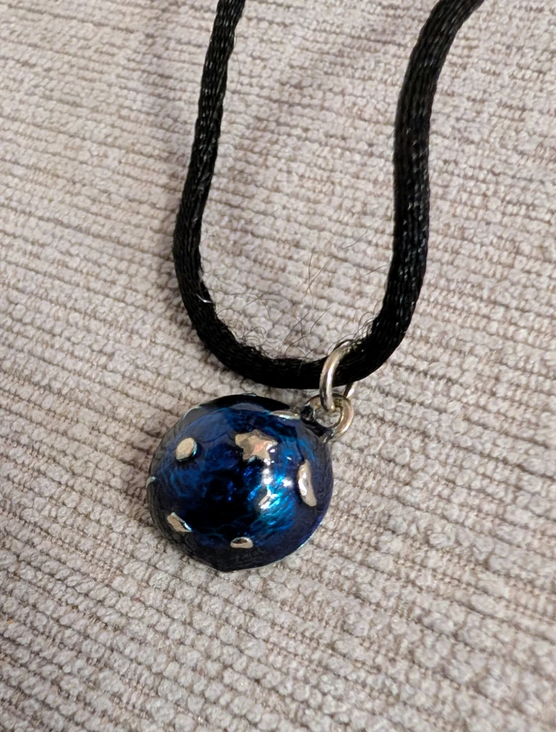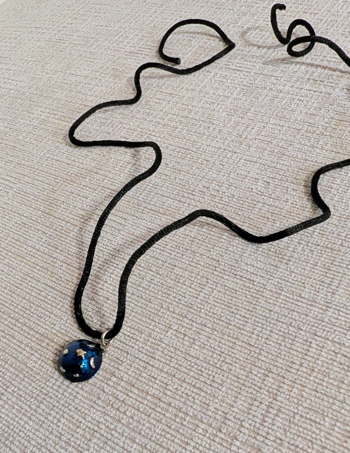 Cute pendant necklace with a dark blue pendant featuring silver-coloured accents. The pendant hangs on a black cord. Perfect for adding a little sparkle to your outfit!