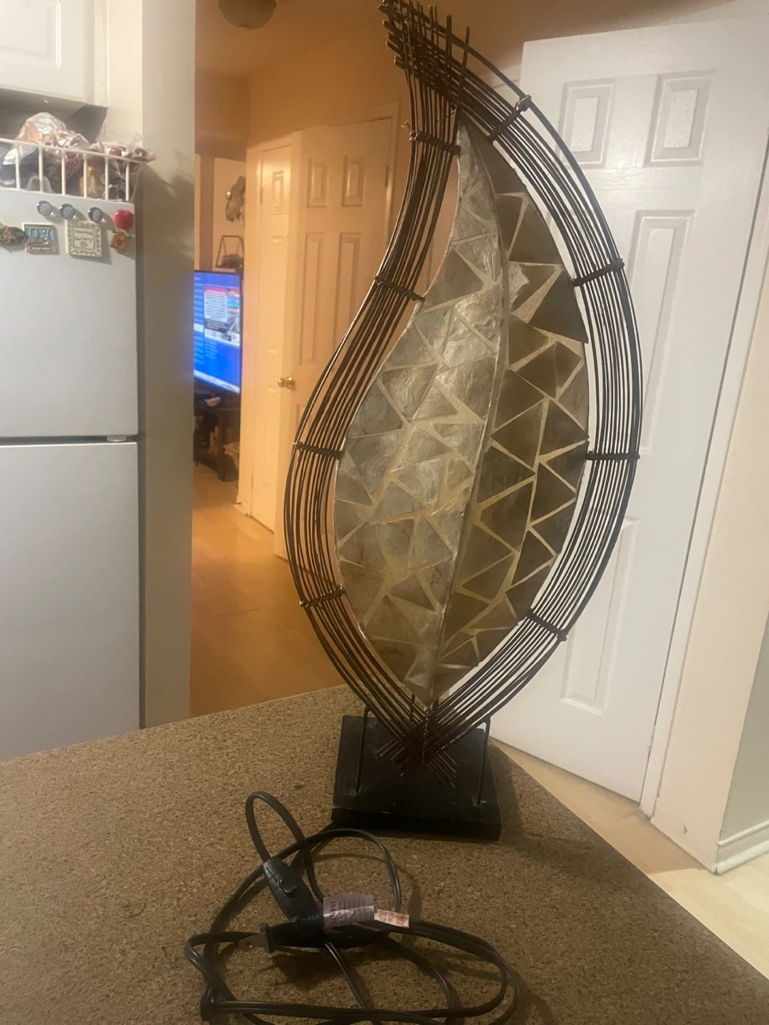 Selling a unique leaf-shaped accent lamp! It has a metal frame and a geometric design on the leaf itself. It would look great in any room as a decorative piece