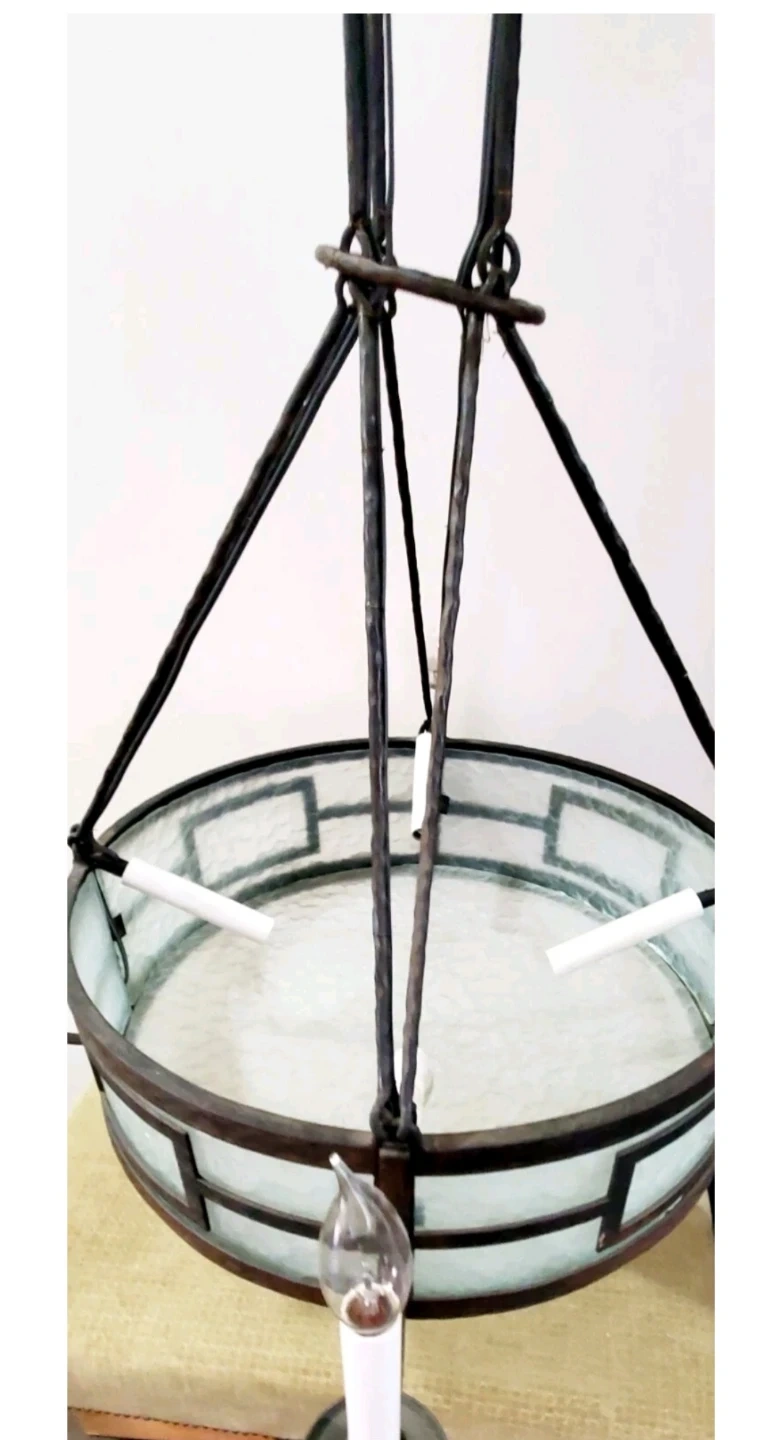 Large - French Art Deco - Wrought Iron & Frosted Glass Chandelier - 8 Lights