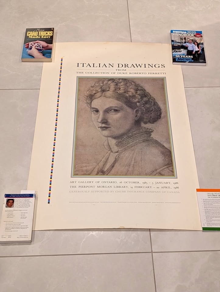 Poster featuring the drawing Portrait of a Young Woman (c. 1520–1525), attributed to Andrea Previtali. It was part of the touring exhibition "Italian Drawings from the Collection of Duke Roberto Ferretti", displayed at the Art Gallery of Ontario and The Pierpont Morgan Library in the mid-1980s.