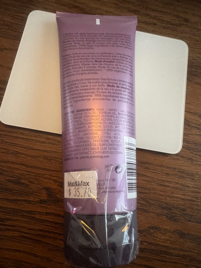Pureology Professional Color Care, 100% vegan, Hydrate Superfood Deep Treatment Mask – BNIP. Bought it at Mat&Max for 37cad (ex vat). Can be yours for 15CAD! Works perfectly, fantastic stuff, but I switched to another brand. Never even opened this package.
