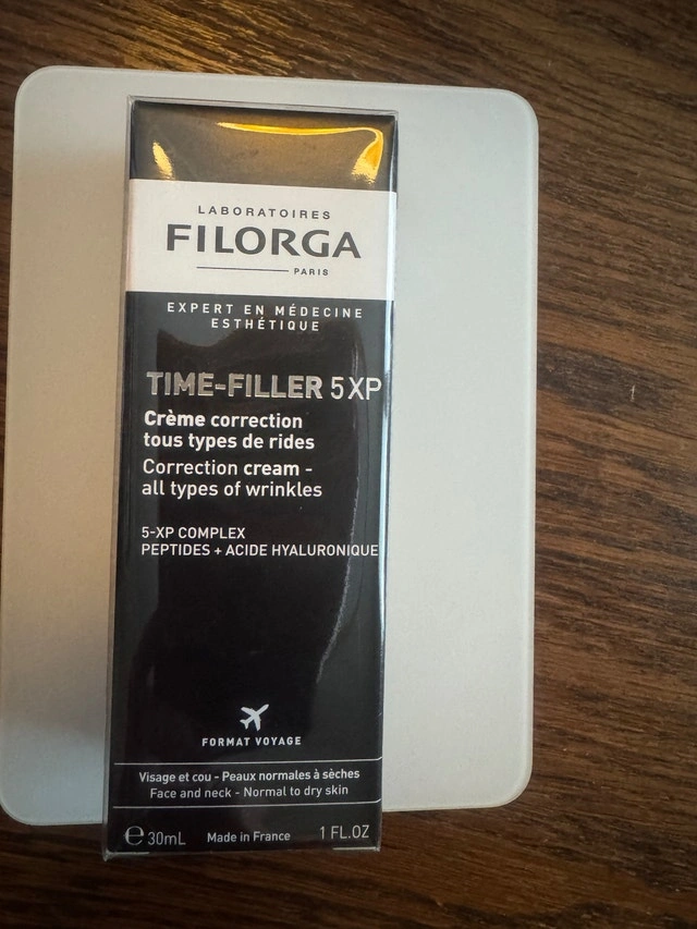 Time-Filler 5XP – 30 ml Correction Cream – all types of wrinkles Brand New in cellophane packaging! Perfect for testing: For 30CAD only (50ml online is 118 / 105cad) for 30 ml. With TIME-FILLER 5XP, FILORGA redesigns its best-selling anti-wrinkle face and neck cream. TIME-FILLER 5XP incorporates the 5XP core formula, inspired by 5 areas of expertise from aesthetic medicine to smooth the 5 types of wrinkles: expression lines, deep wrinkles, dryness wrinkles, surface wrinkles and neck wrinkles. TIME-FILLER 5XP is available in 2 textures : a cream for [normal to dry skin] or a gel-cream for [combination to oily skin] to combat 5 types of wrinkles. /Expression Lines TIME-FILLER 5XP integrates a tripeptide inspired by botulinum toxin injections to relax the features. /Deep Wrinkles A complex of matrikines is combined with encapsulated hyaluronic acid inspired by filling injections to fill in deep wrinkles. /Surface Wrinkles TIME-FILLER 5XP benefits from the resurfacing properties of sea fennel inspired by peels, for a smoothing action on surface wrinkles, without irritating or drying the skin. /Dryness Wrinkles The NCEF, FILORGA’s iconic core formula blends with a botanical extract, inspired by revitalising injections to plump the skin. /Neck Wrinkles A botanical extract inspired by lifting threads to restructure neck wrinkles. Smoothing effectiveness clinically proven. Ideal for normal to dry skin, the generous and enveloping texture of TIME-FILLER 5XP provides absolute comfort. Tested under dermatological control. Jar 50ml.online is 118CAD excl VAT. On amazon 105cad. Cash accepted.