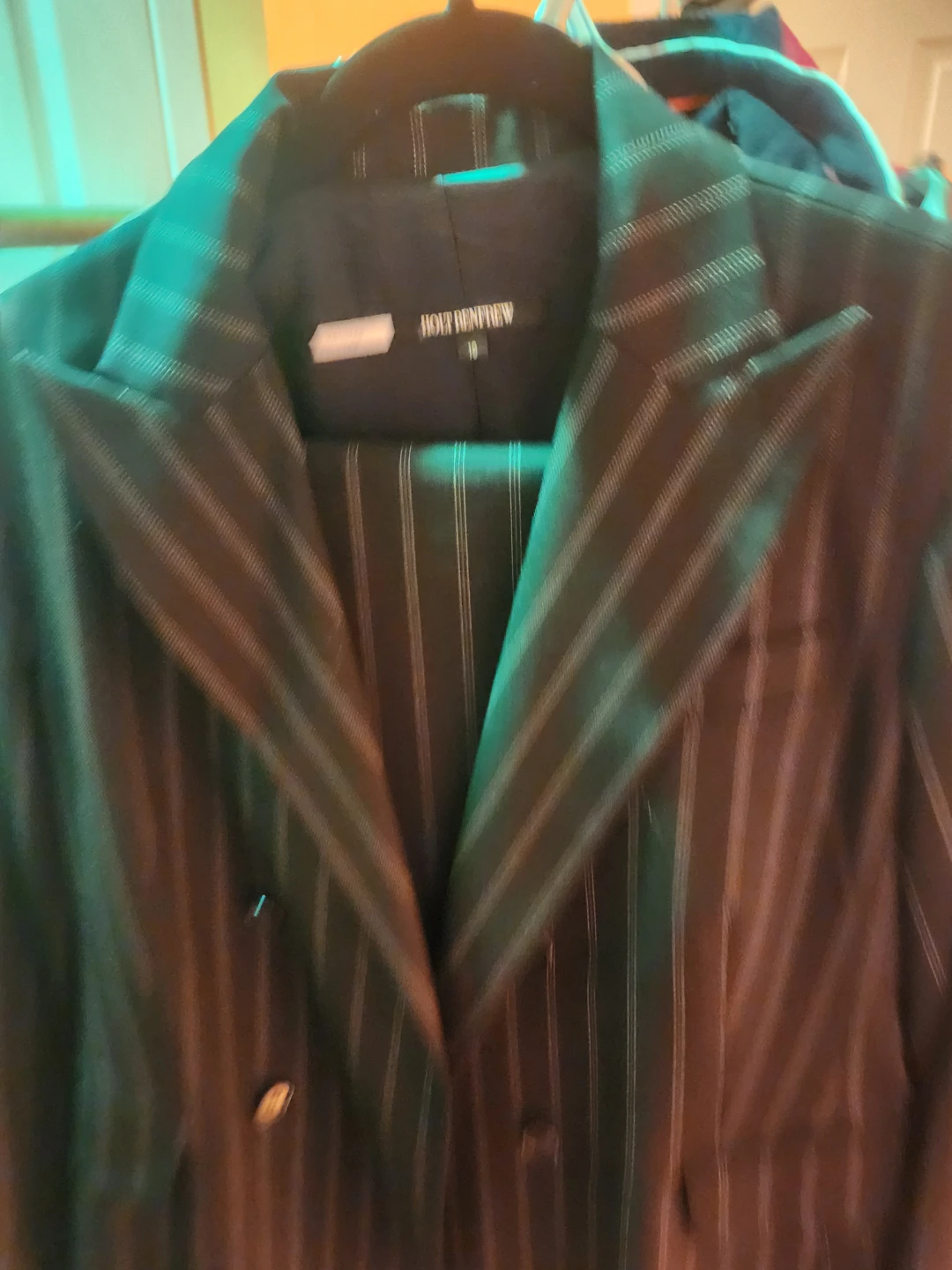 Selling a Holt Renfrew pinstripe suit in size 10. It's in great condition and ready for a new owner! The classic pinstripe design adds a touch of sophistication to any occassion. Its a pair with skirt