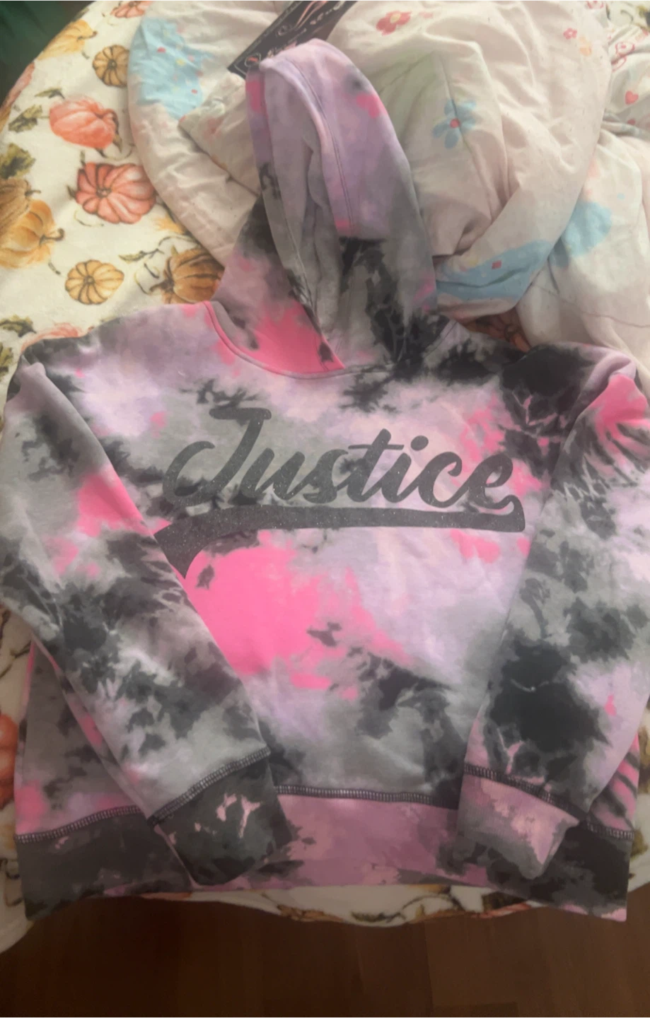Here's a cute Justice hoodie with a tie-dye pattern! It's got shades of pink, grey, and black. I never has been wore just once.