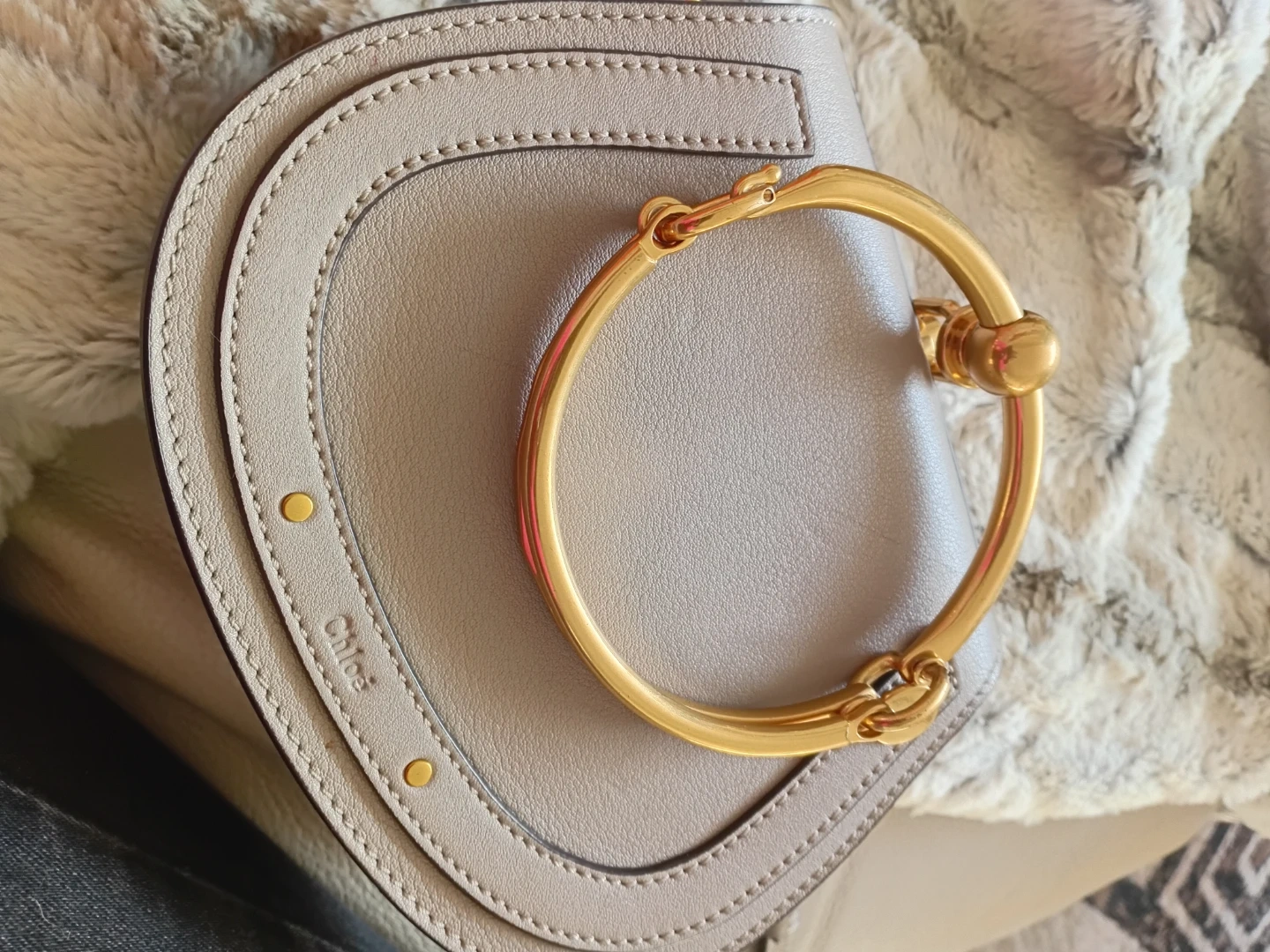 Here's a stylish grey leather handbag from Chloé. It features a unique gold-tone metal handle. The bag is in great condition and ready for a new owner!
