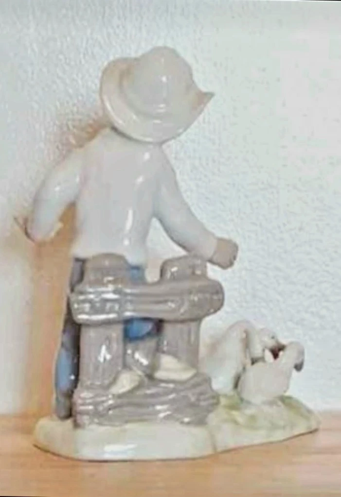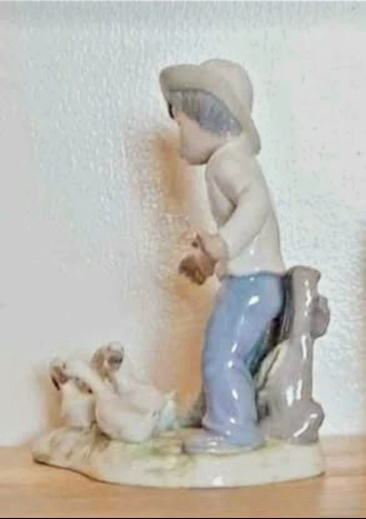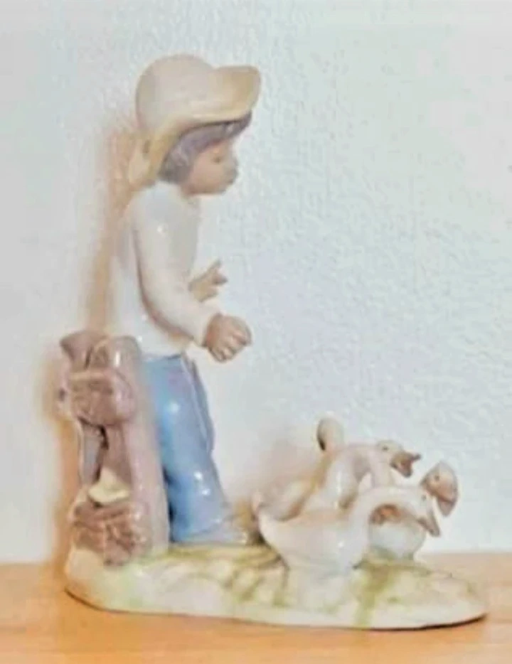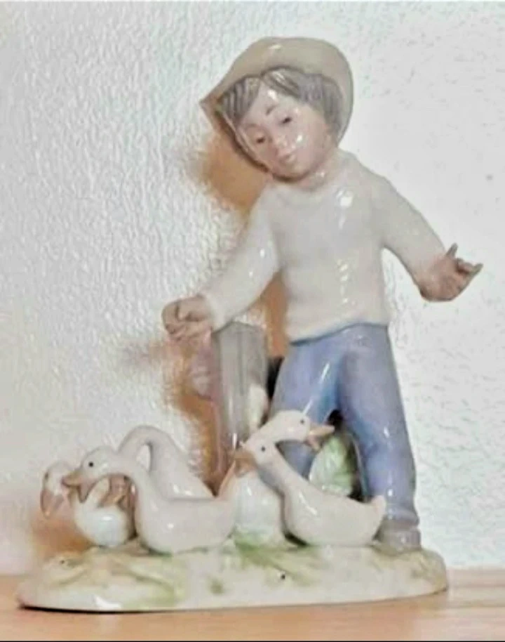 This is a Vintage , Nostalgic appeal, carries a unique character,Tengra, Hand Painted Porcelain figurine featuring a boy with geese, crafted with attention to detail and capturing a charming scene. The figurine depicts a young boy lovingly interacting with a group of geese, showcasing a peaceful and idyllic moment.