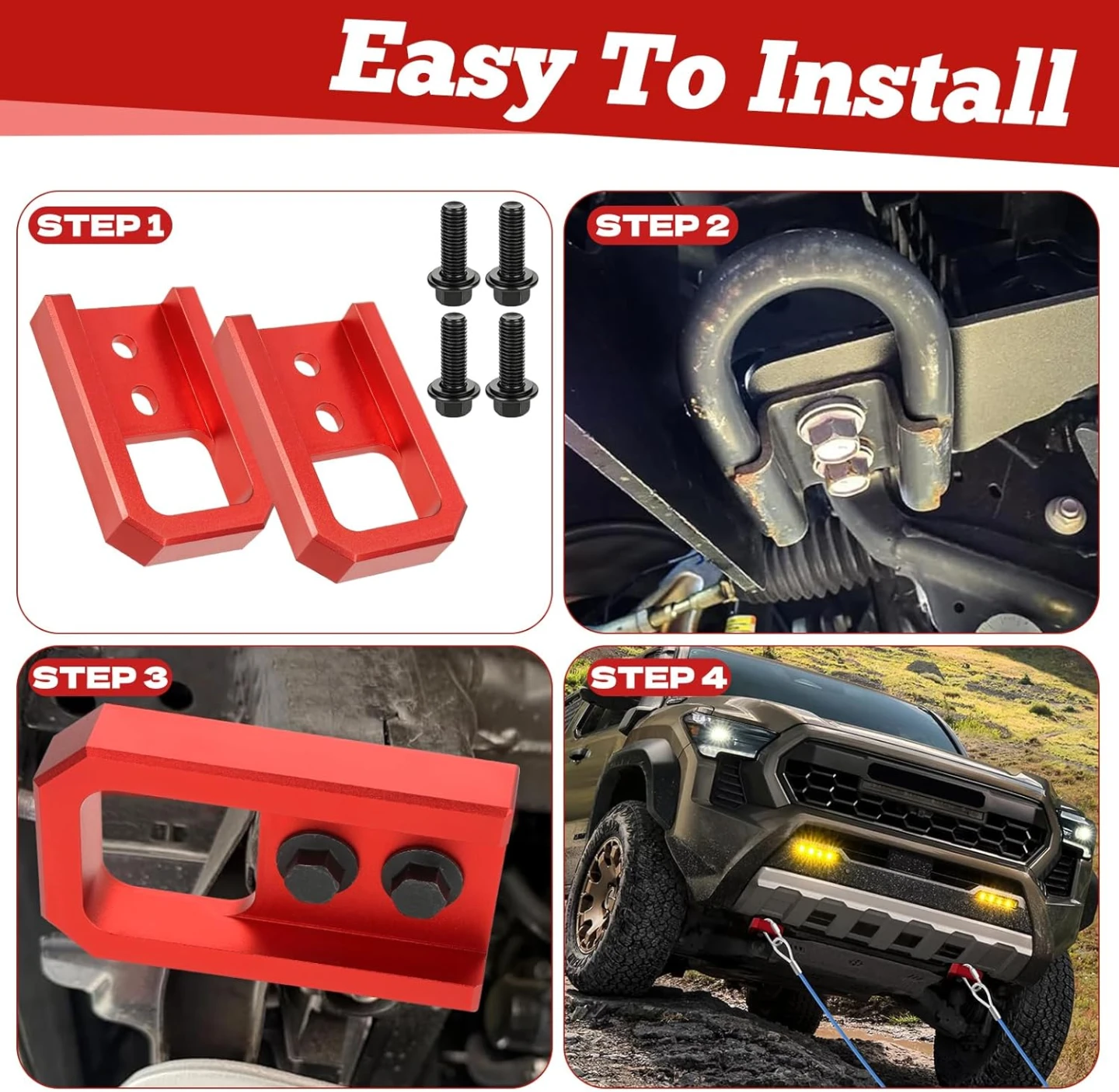 High-Visibility Color: The bright red finish creates a standout look and allows you to locate the tow hook quickly in muddy terrain or low-light environments. Our front tow hook for tacoma 2025 accessories enhances the front-end style of the Tacoma or 4Runner while providing practical visibility during recovery.