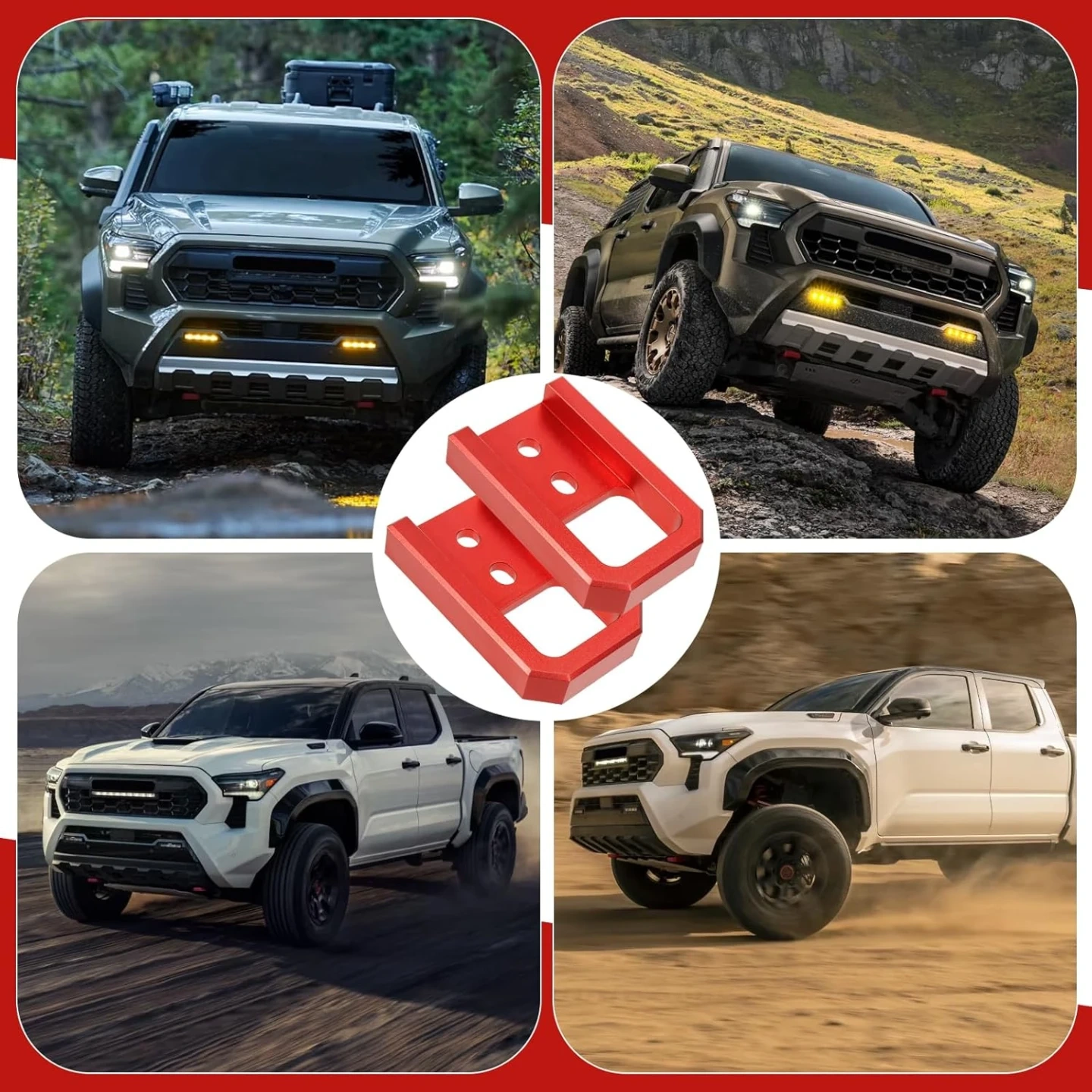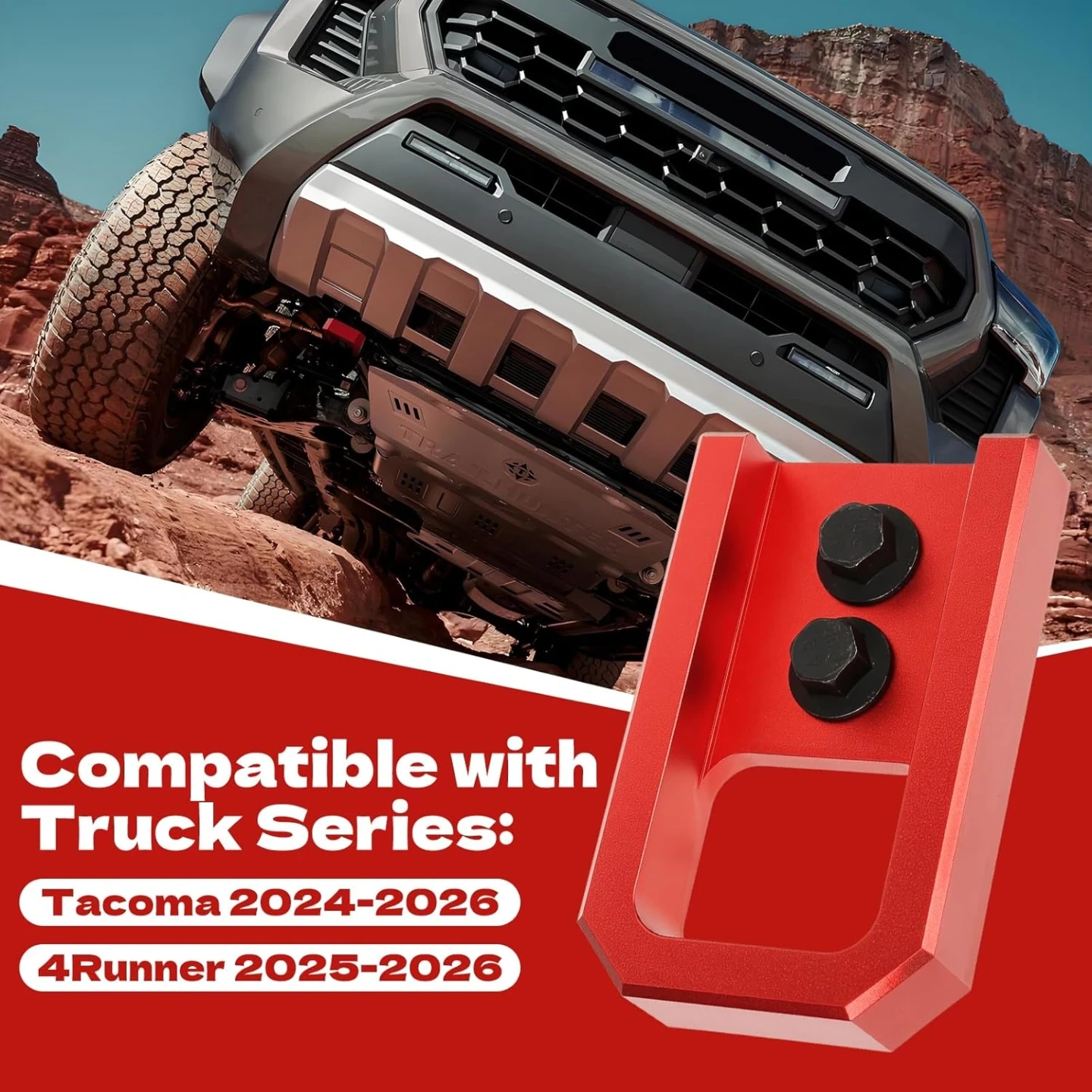 Custom Fit for Tacoma/4Runner: The tow hook features a unique design that fits the Tacoma 2024–2026, 4Runner 2025–2026, and Land Cruiser 250 2024–2025. It provides a secure point for attaching a tow strap or rope when the vehicle gets stuck in mud, sand, or snow. The installation process is straightforward and aligns accurately with the vehicle’s front-end structure for a precise fit.