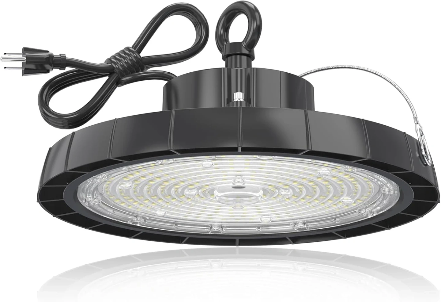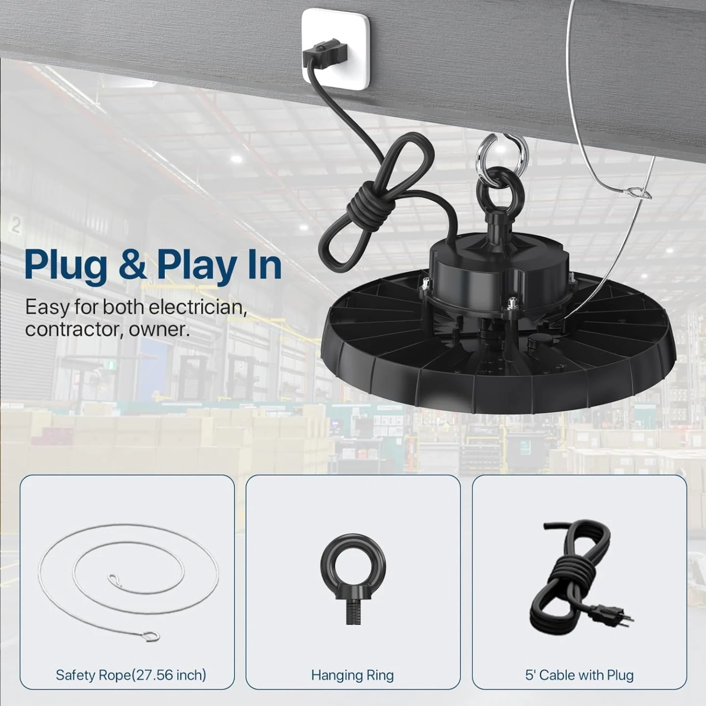 Effortless Installation: Designed for convenience, the ufo led high bay light includes a pre-installed hang ring, a 5FT power cord, and a plug-and-play 3-prong North American plug. A 27.56 inch safety rope is also provided for added security, allowing you to complete installation in just a few minutes without any hassle.