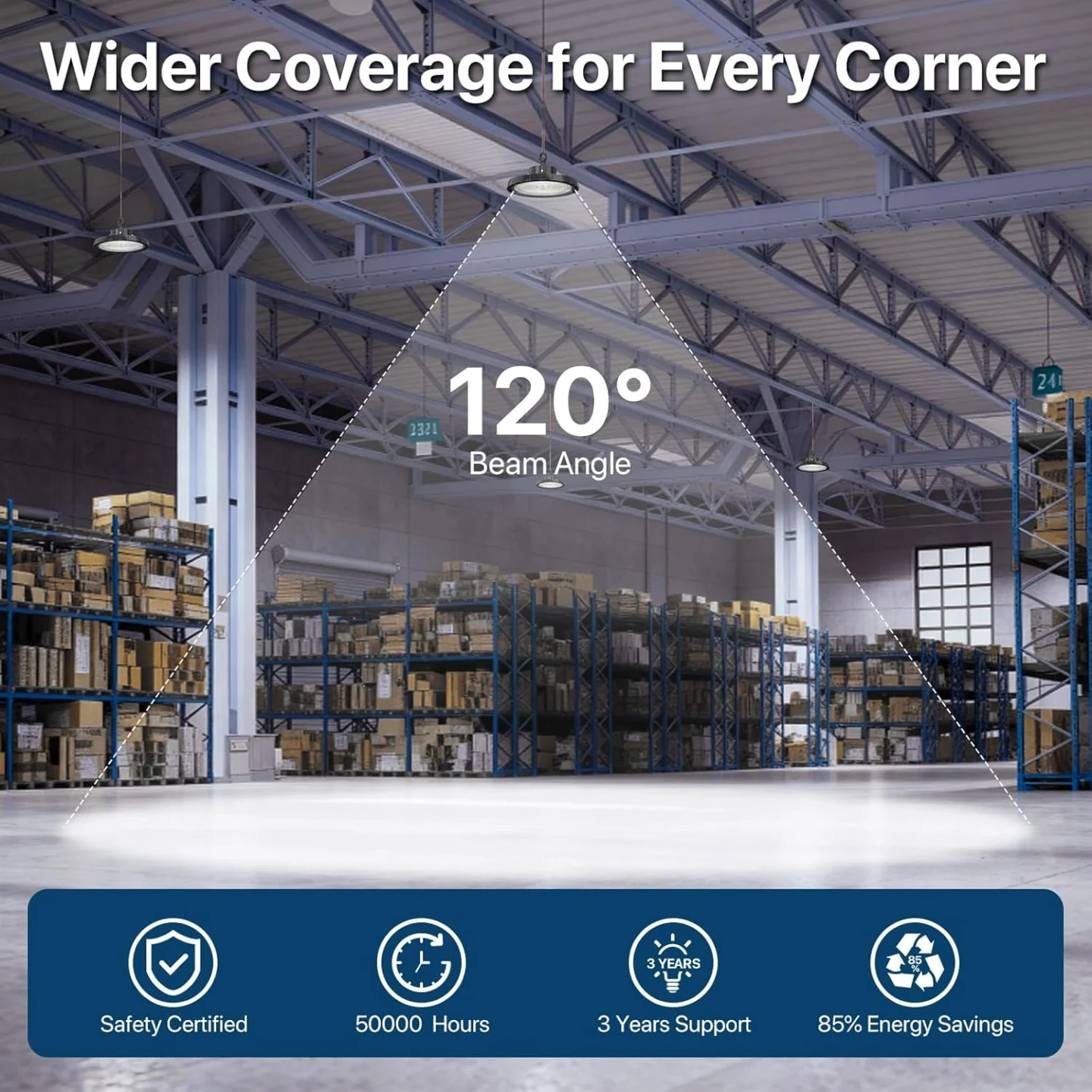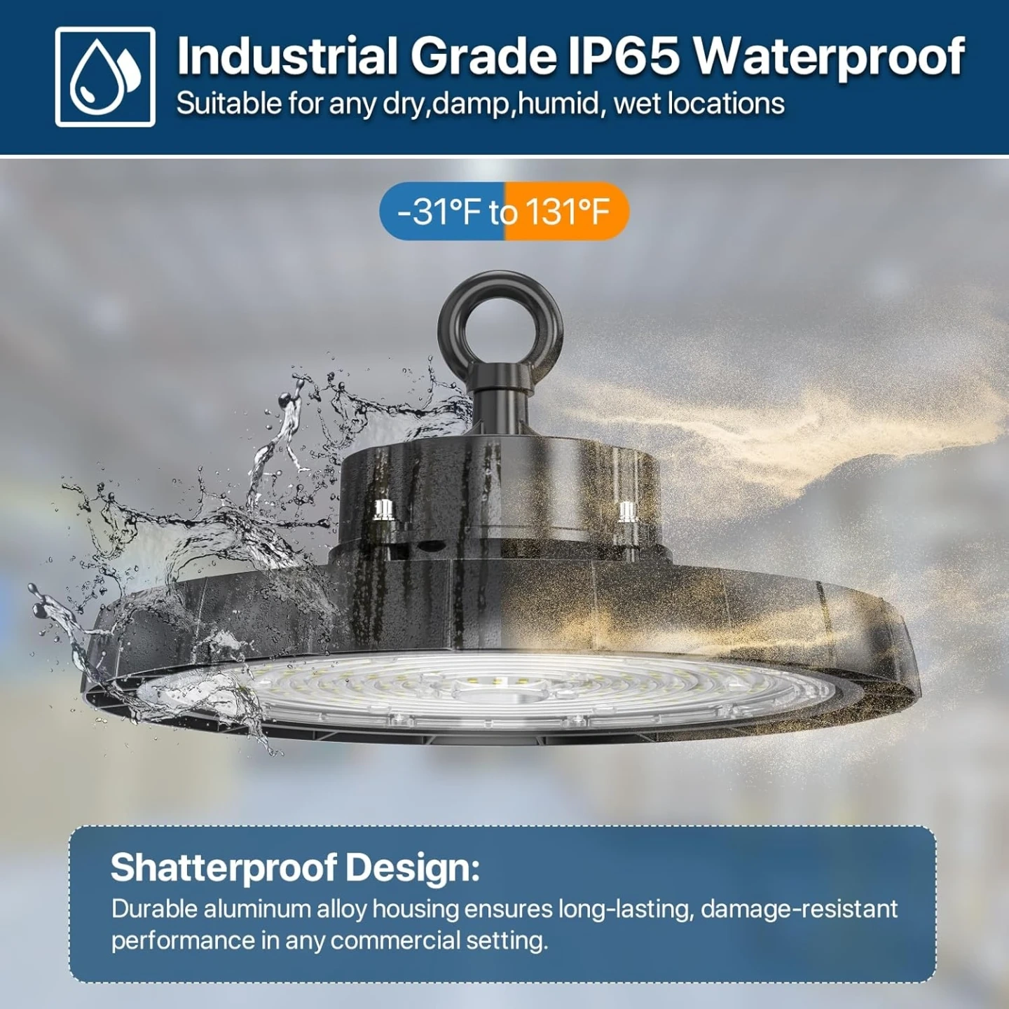 Wide Applications & Optimal Coverage: With an IP65 waterproof and dustproof rating, this high bay lights is versatile enough for both indoor and outdoor use. Its 120° wide beam angle ensures maximum coverage, making it ideal for warehouse, workshop, garage, factory, barn, gym, and many other settings where reliable lighting is essential.