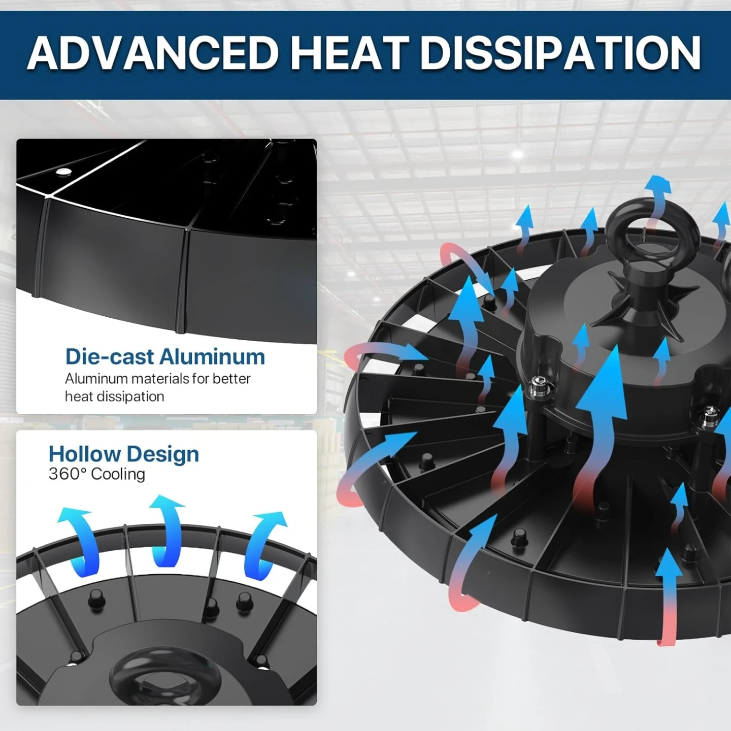 Robust & Long-Lasting Design: Crafted with a premium die-cast aluminum housing and a hollow heat sink design, this high bay led shop lights guarantees excellent heat dissipation and durability. Its extended lifespan of over 50,000 hours ensures years of reliable, maintenance-free performance, making it the perfect choice for industrial and commercial use.