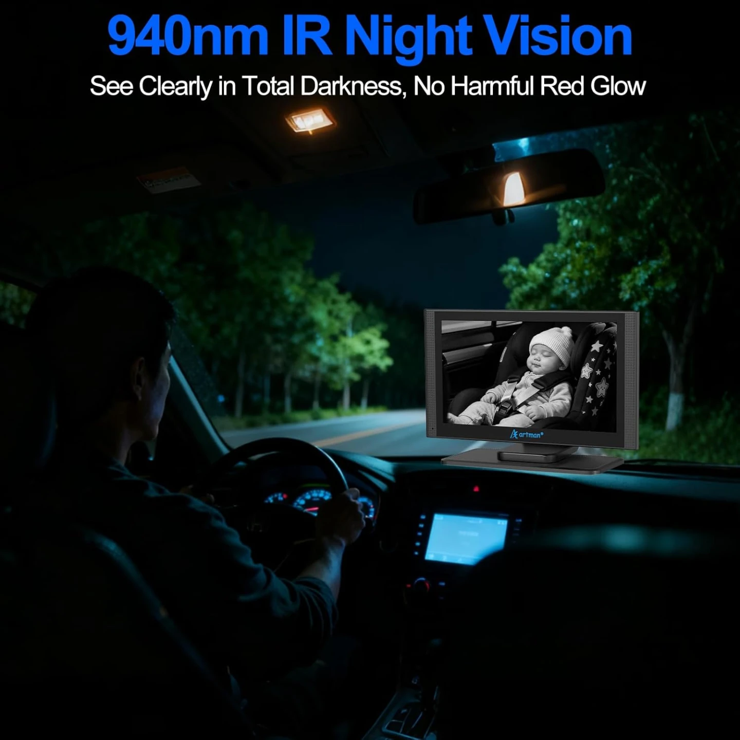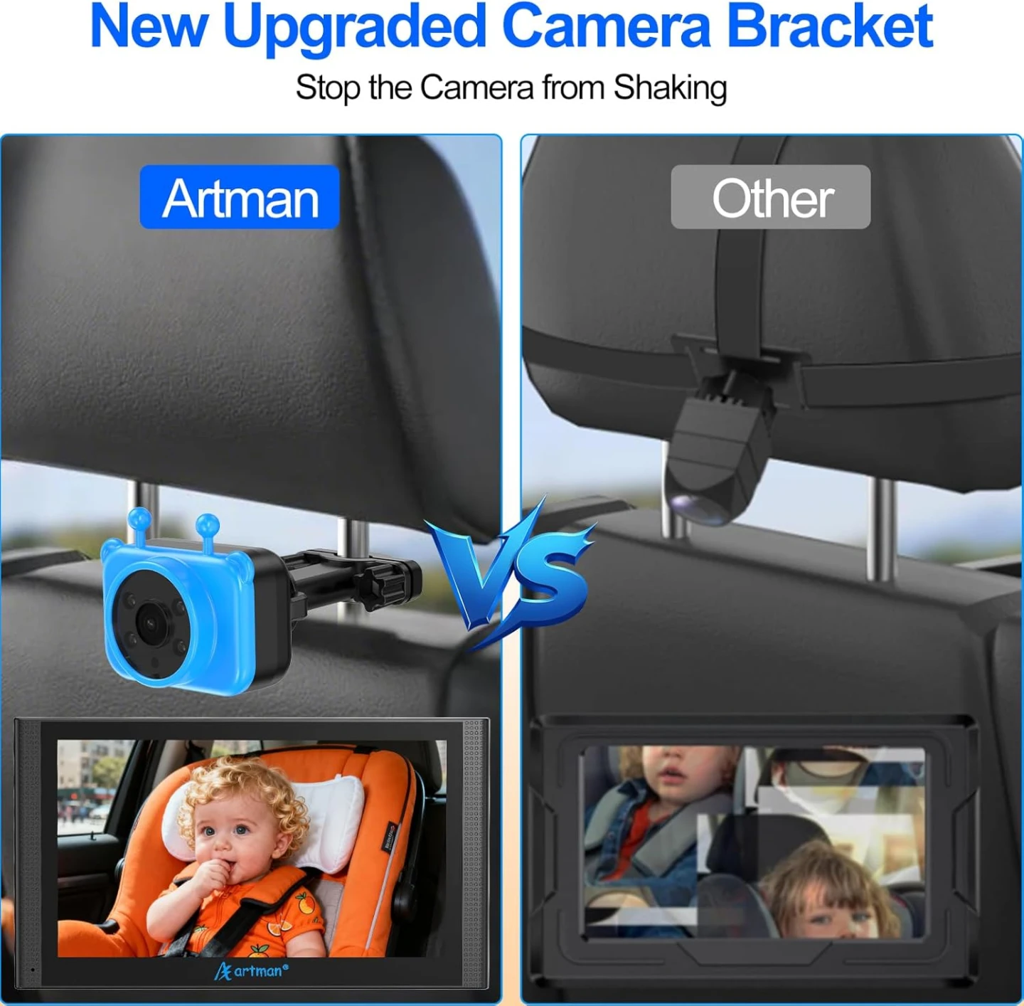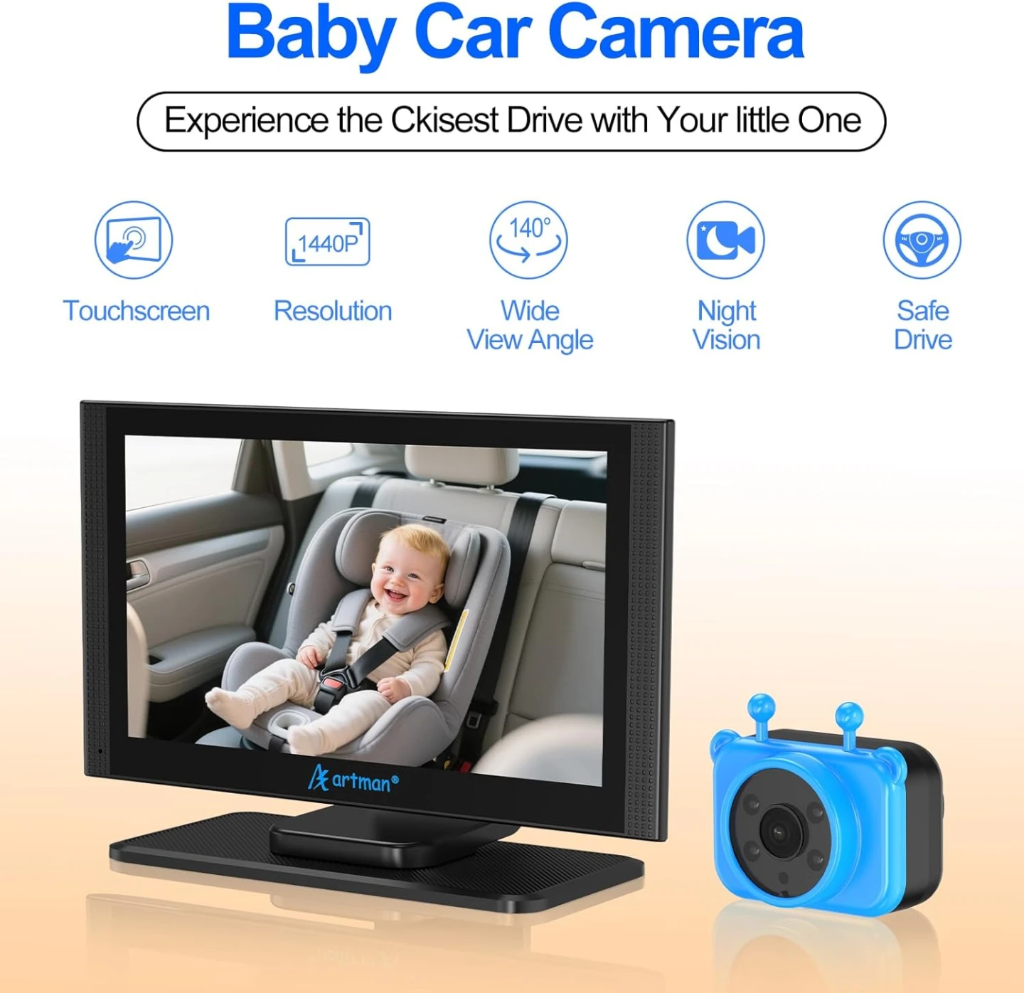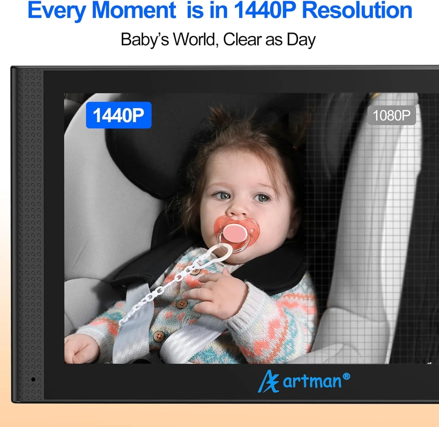 New Design & Lager Display: Artman baby car camera with 7.2-inch 1440P HD display design, along with a unique split-screen feature.This car baby monitor shows every detail of your baby' s movement, helping you stay focused while keeping an eye on the back seat.The split-screen function allows you to monitor the real-time status of two babies at the same time, giving you double peace of mind and constant companionship.