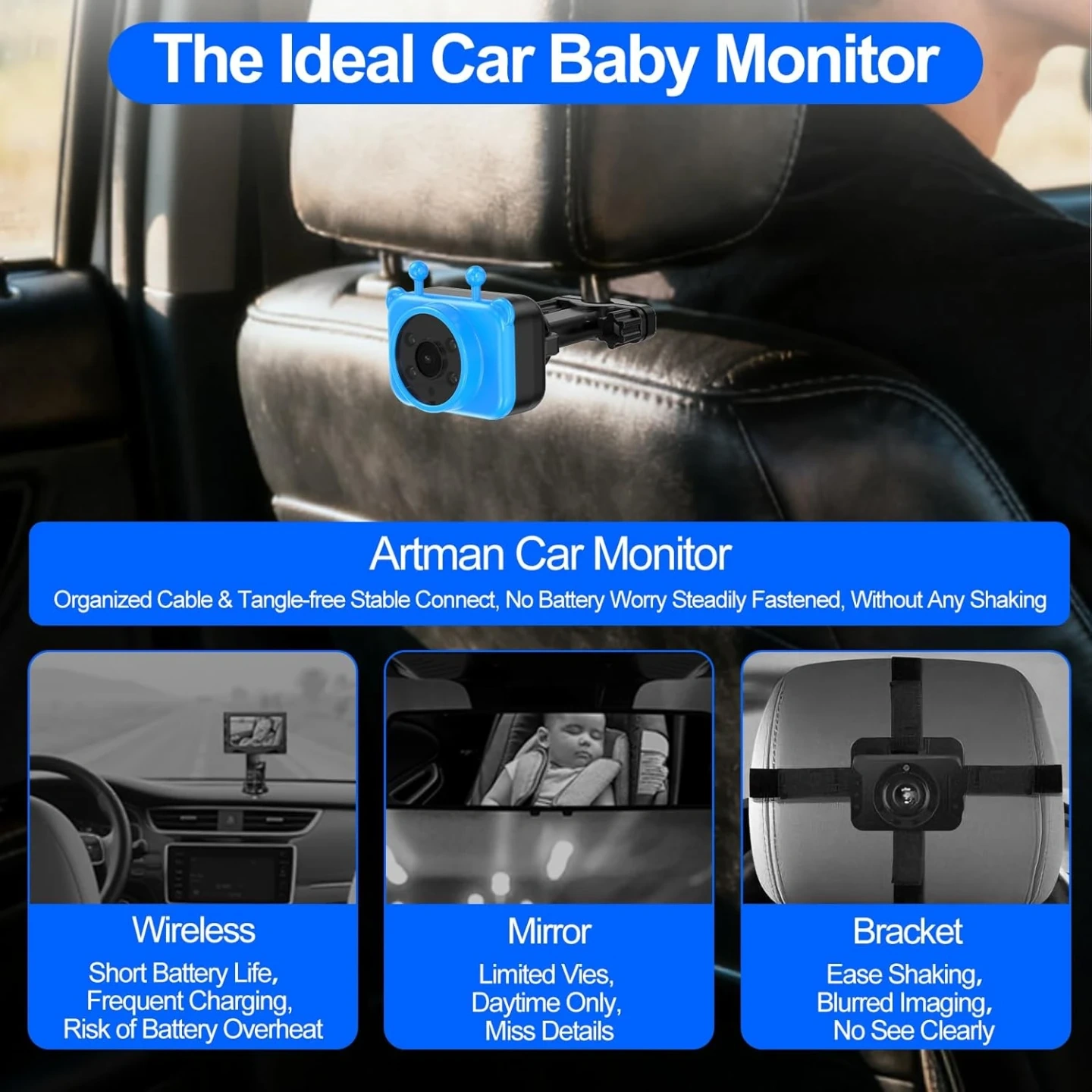 Easy Installation & Worry-Free Monitoring: Artman car camera for baby can be set up easily in 5 mins by every parent. First, attach the camera bracket to the headrest of your car and the camera to the bracket. Then, connect the cables to the dashboard-mounted stroller monitor and camera. Then, plug the camera into the cigarette lighter to power it up.