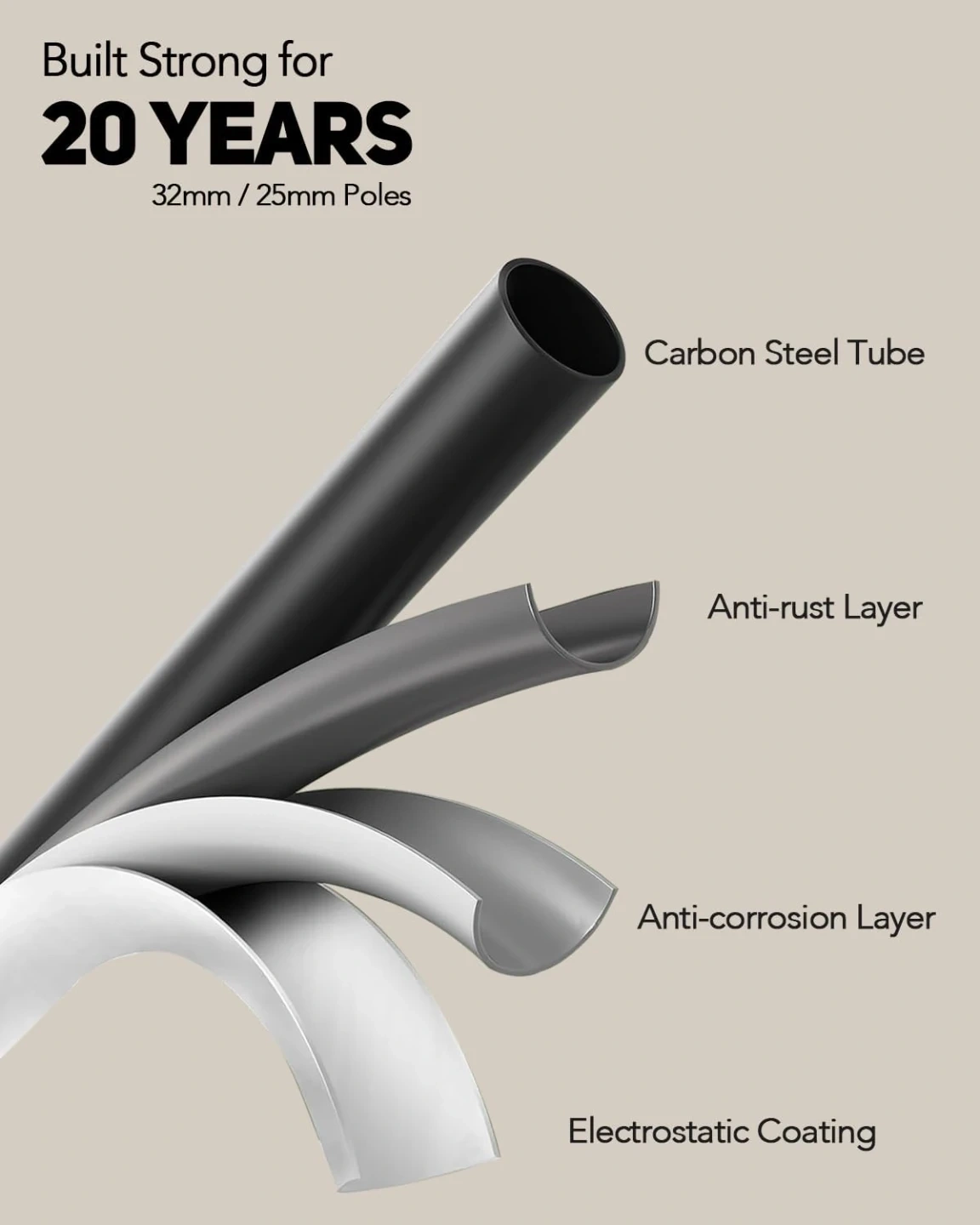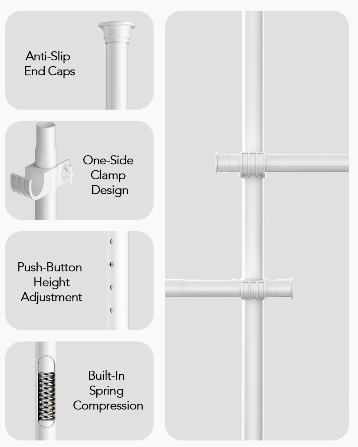 Floor-to-Ceiling Tension Mount: Adjustable height tension system installs securely between floor and ceiling without drilling, protecting walls while offering strong, stable support