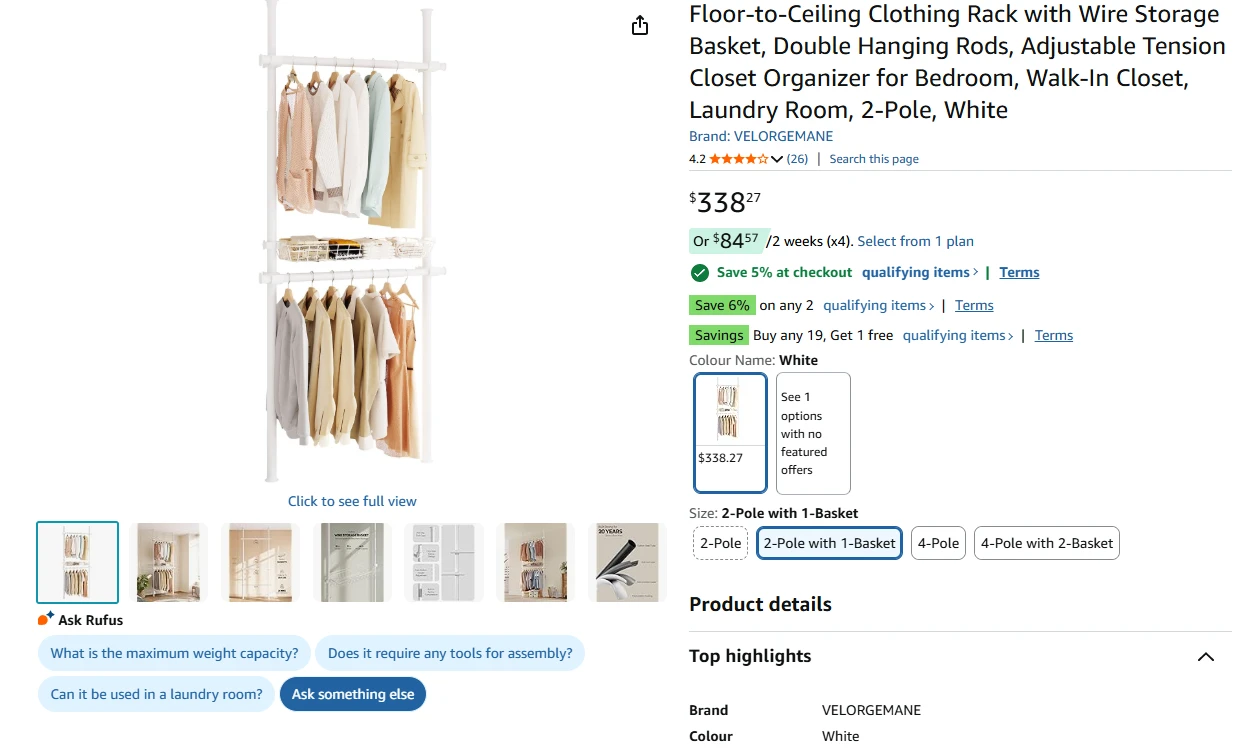 Floor-to-Ceiling Clothing Rack with Wire Storage Basket BNIB