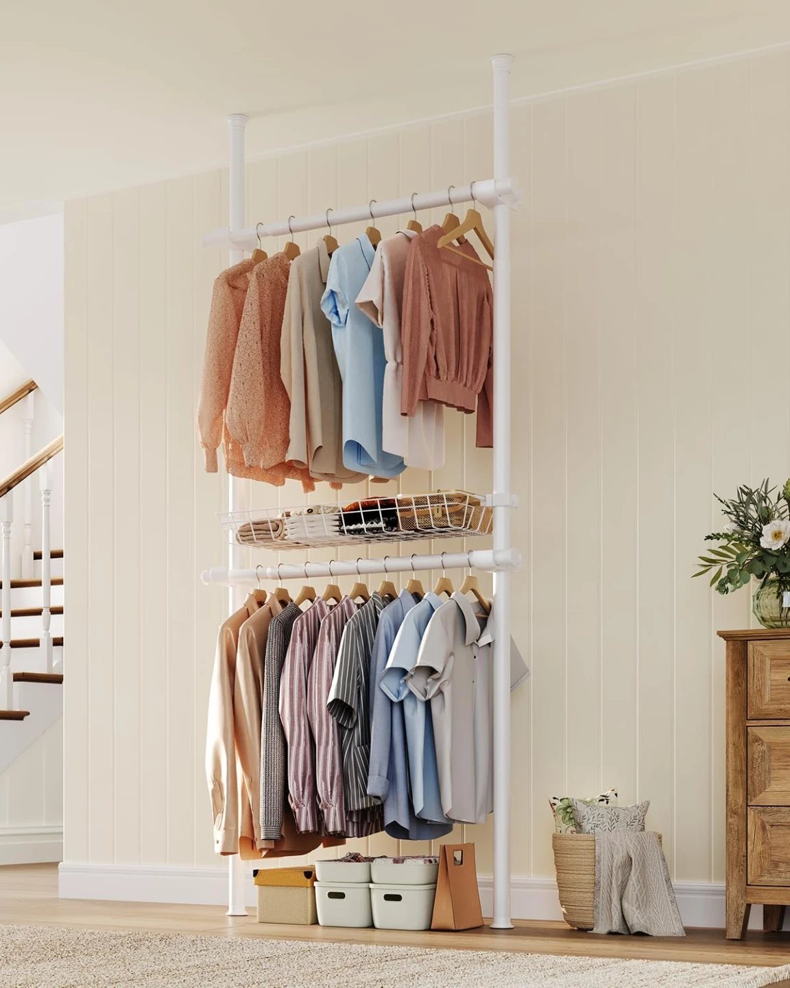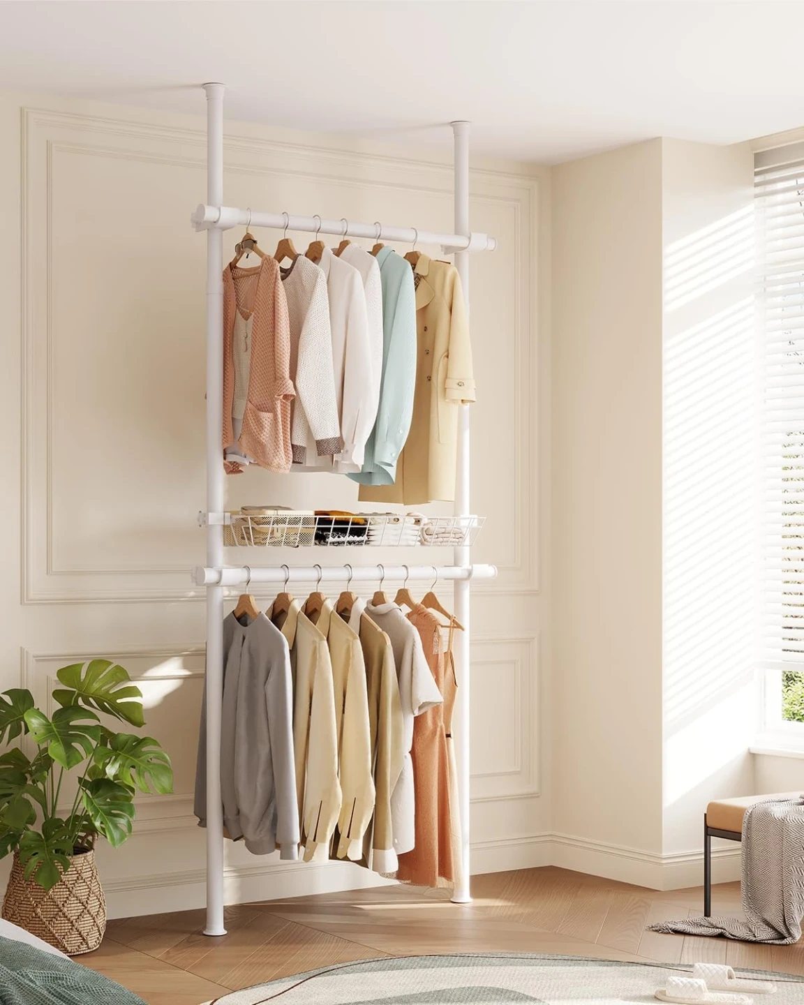 Floor-to-Ceiling Clothing Rack with Wire Storage Basket, Double Hanging Rods, Adjustable Tension Closet Organizer for Bedroom, Walk-In Closet, Laundry Room, 2-Pole, White, Brand New in the Box/Sealed