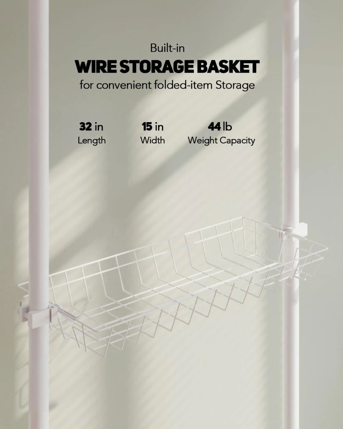 Built-in Storage Basket: Integrated metal wire basket provides convenient storage for folded clothes, accessories, bags, or daily essentials—keeping everything organized and within reach