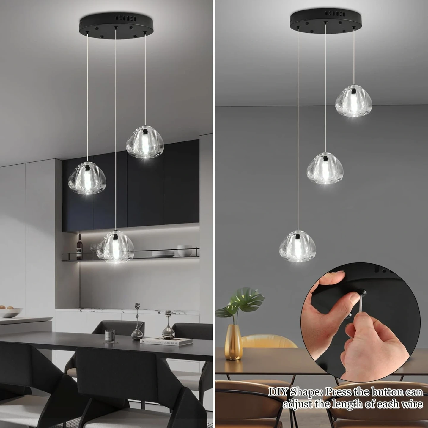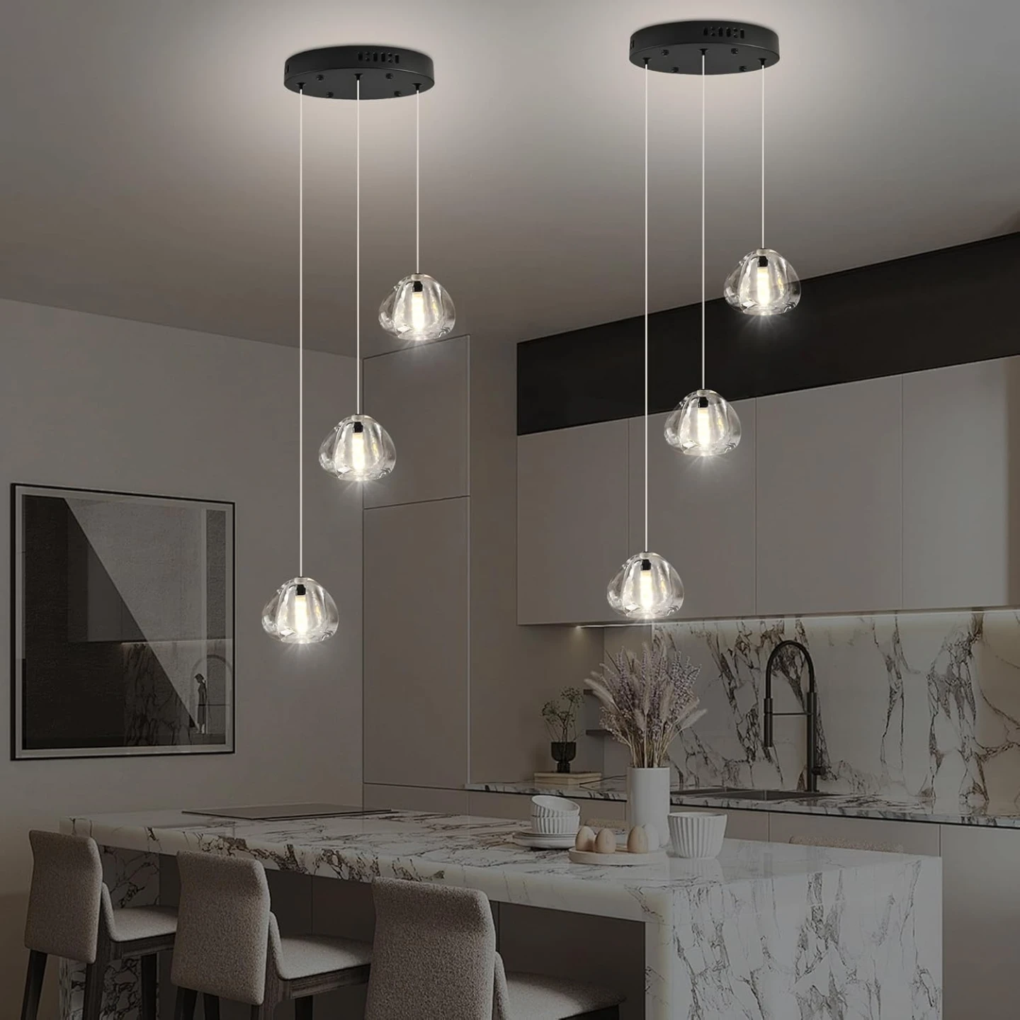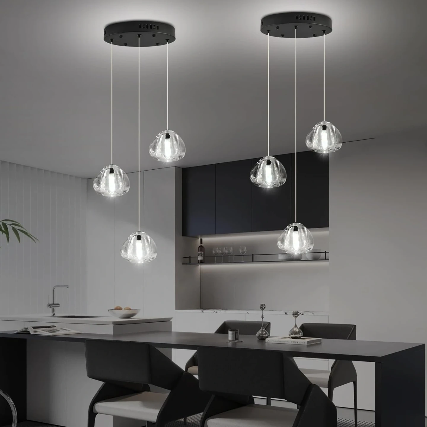 Modern Crystal Chandelier: Black finished metal canopy, 7 elegant bubble crystal ball spiraling downward, the beautiful reflection of light through the bubbles in the clear crystal, creates a cozy and comfortable home atmosphere.