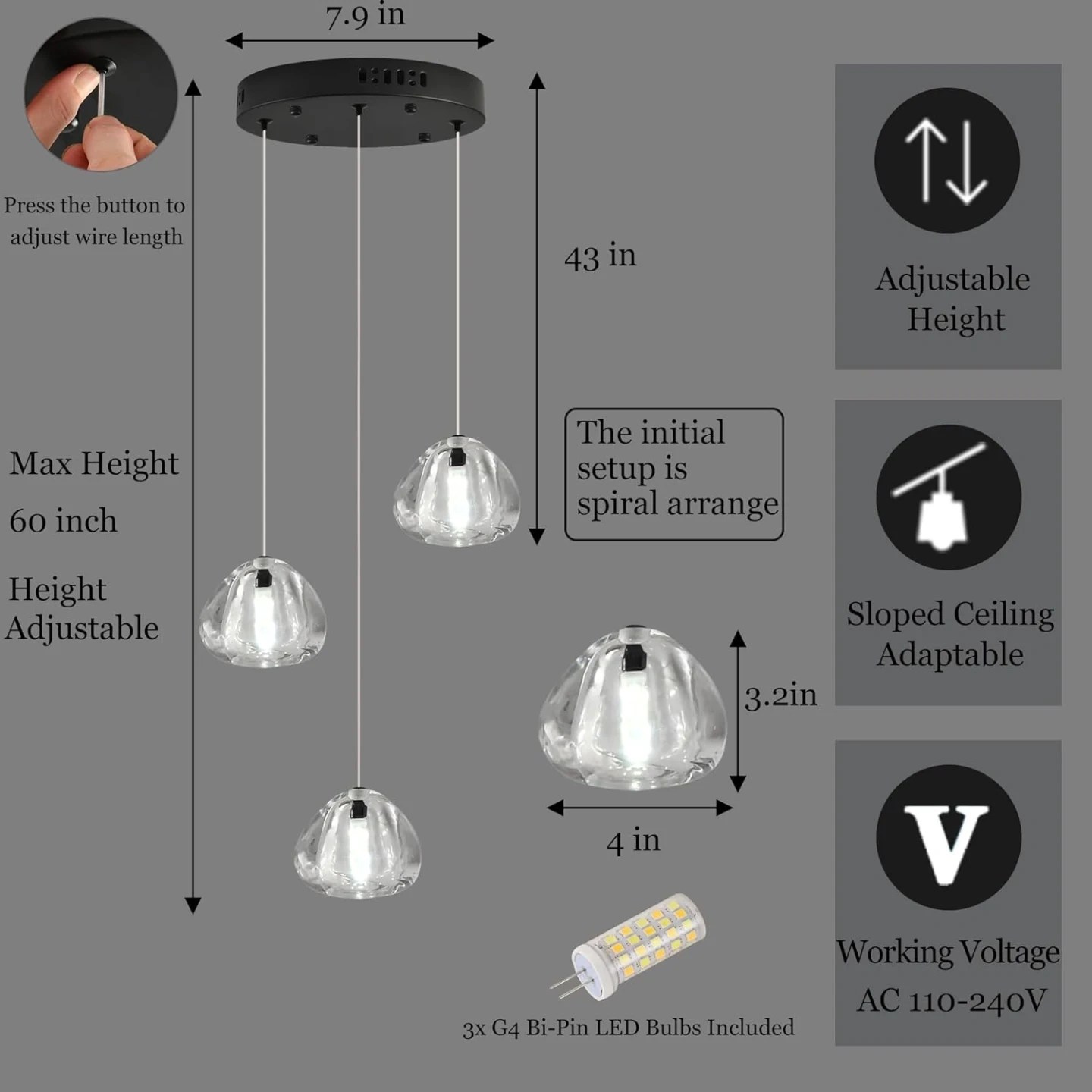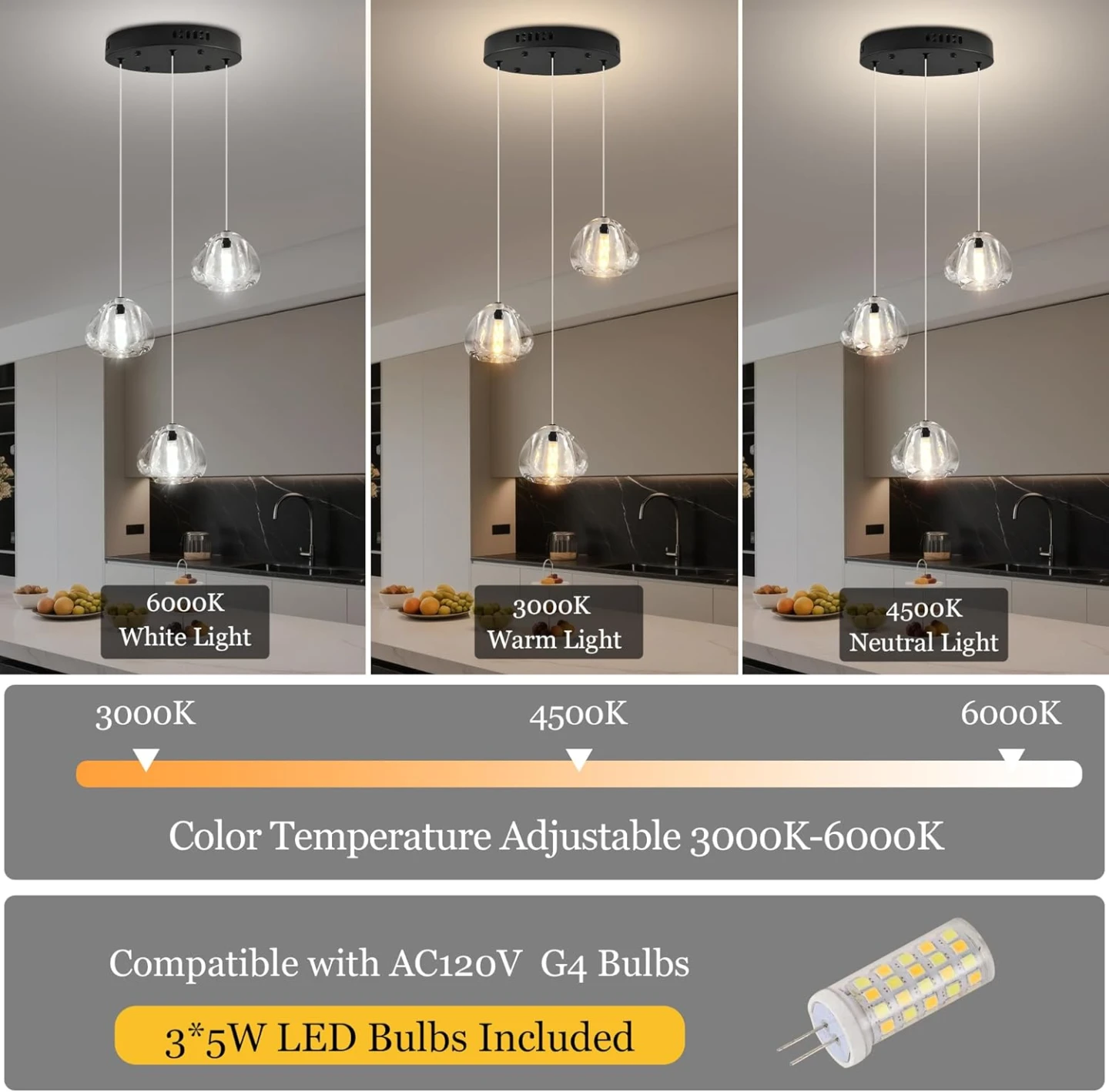 G4 Bulbs: 7x 5W G4 LED bulbs (included), 3 color temperatures (3000K warm light, 4500K neutral light, 6000K white light), not dimmable. Easy to replace, compatible with any AC110V G4 base bulb. Fully dimmable when used with dimmable G4 bulb and compatible dimmer switch.