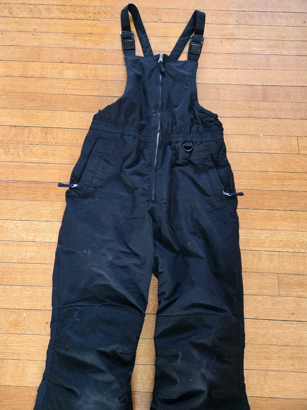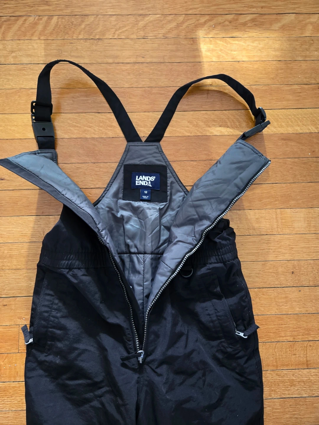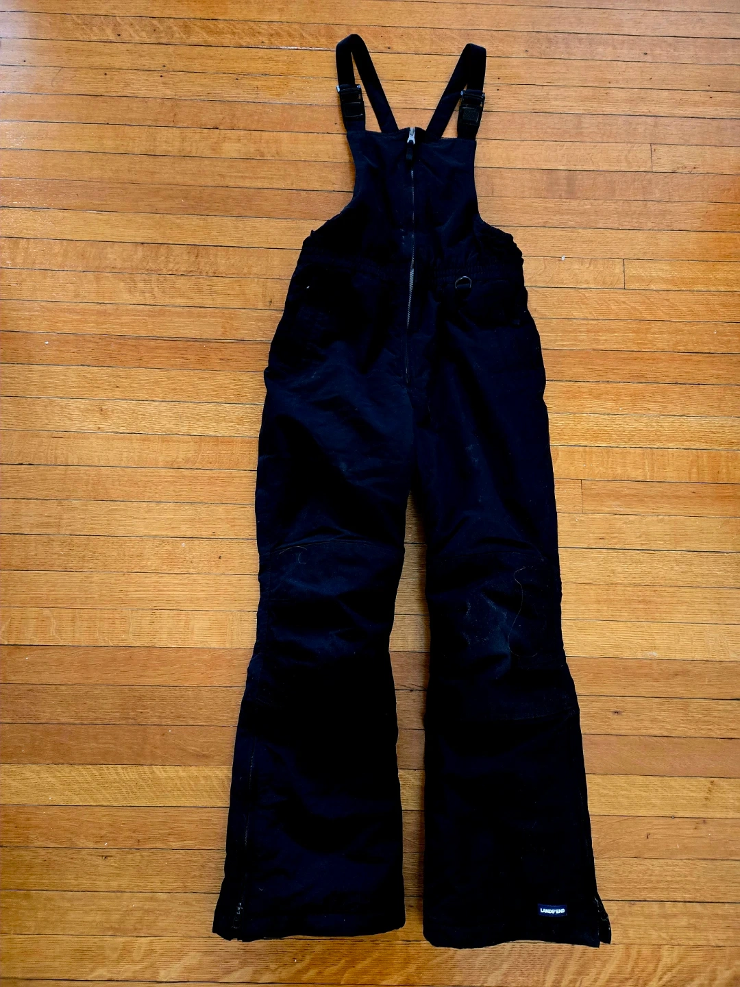 Lands' End black bib snow pants in great condition! They are a kids' size 12. Zippered pockets. Adjustable straps. They have been worn only once or twice as they were quickly outgrown.