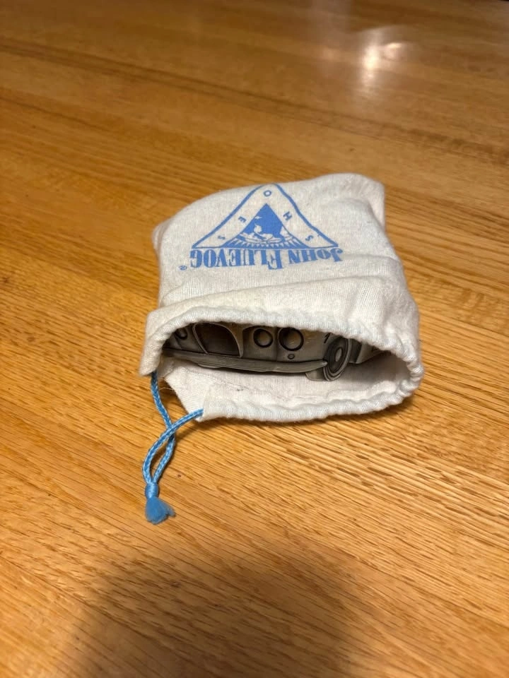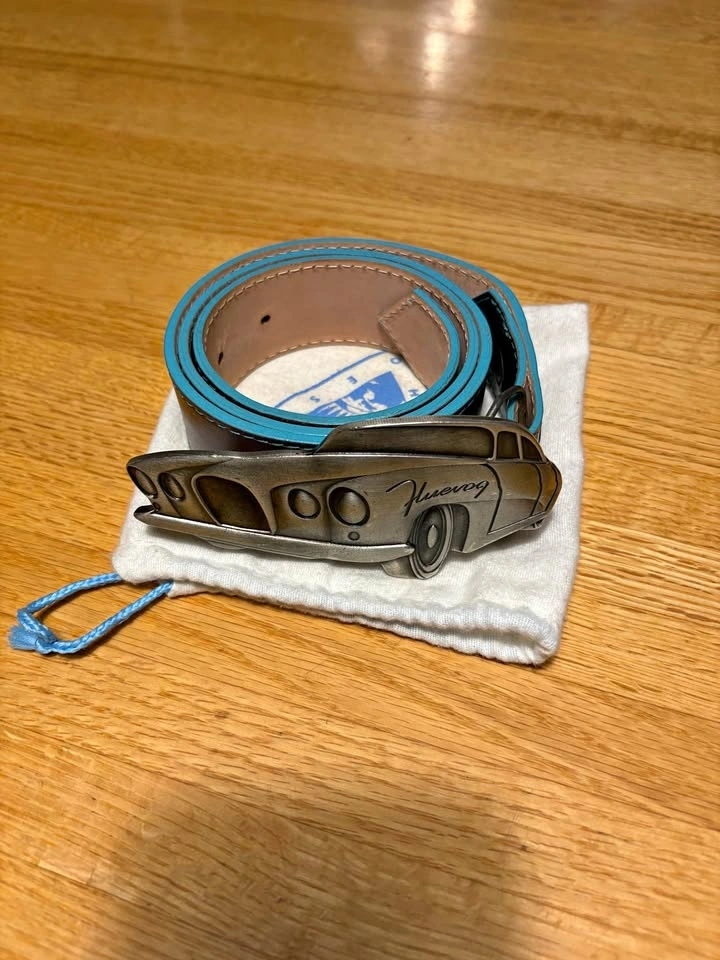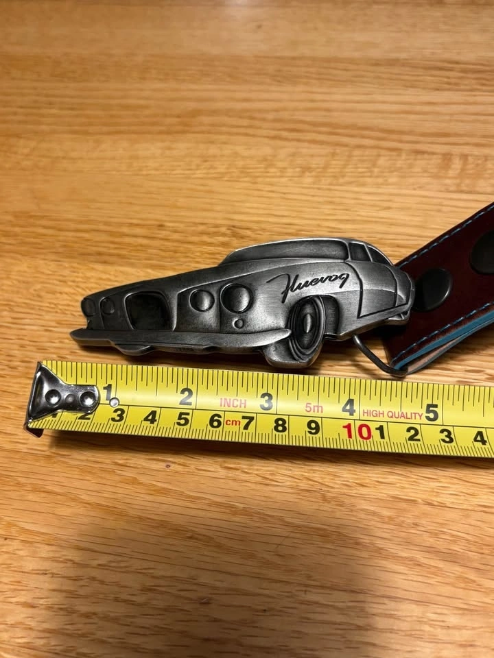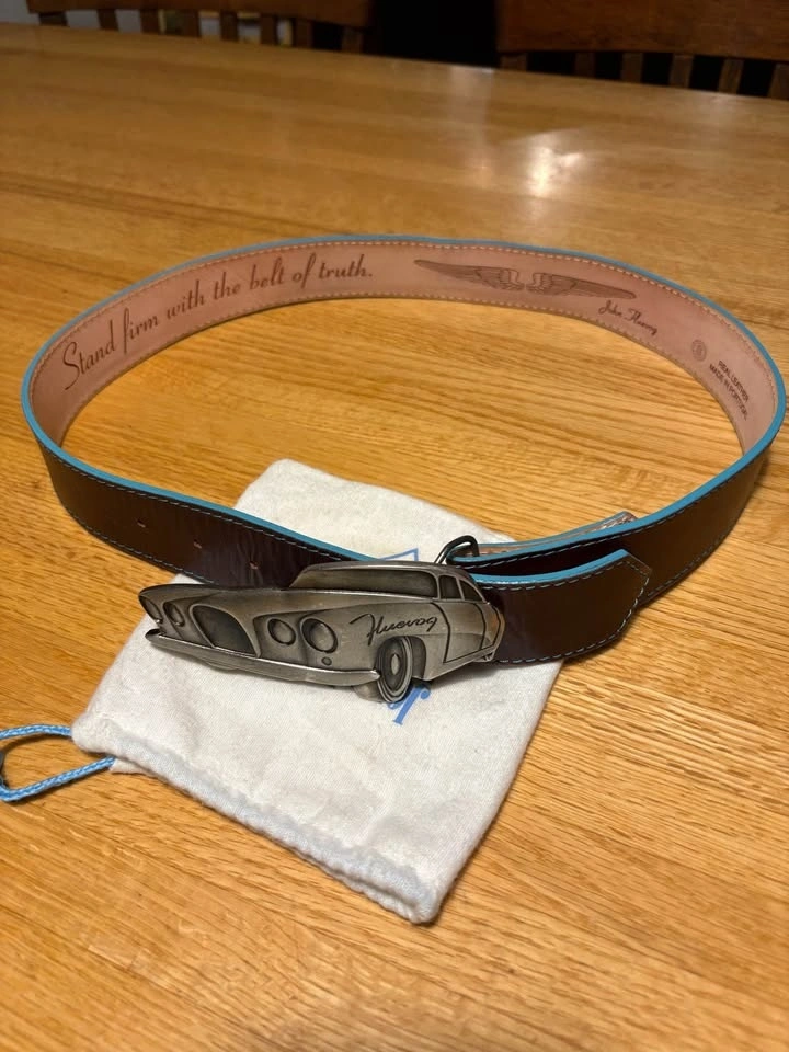 Fluevog Brown leather belt with a silver-toned car buckle. The belt has blue stitching and comes with original white cloth bag logo. Fits around 32-34". Used only a handful of times, otherwise in the back of my closet in its bag.