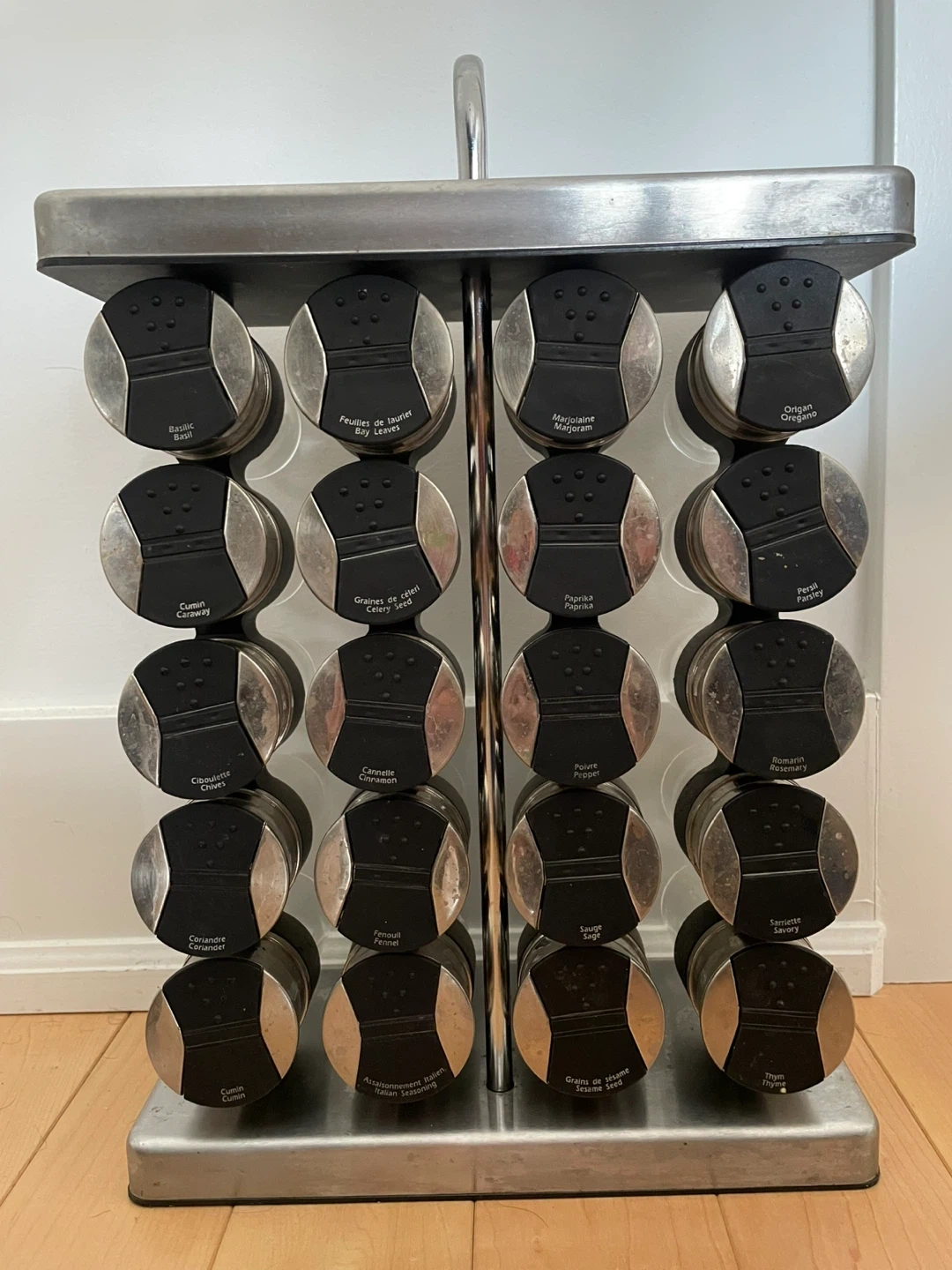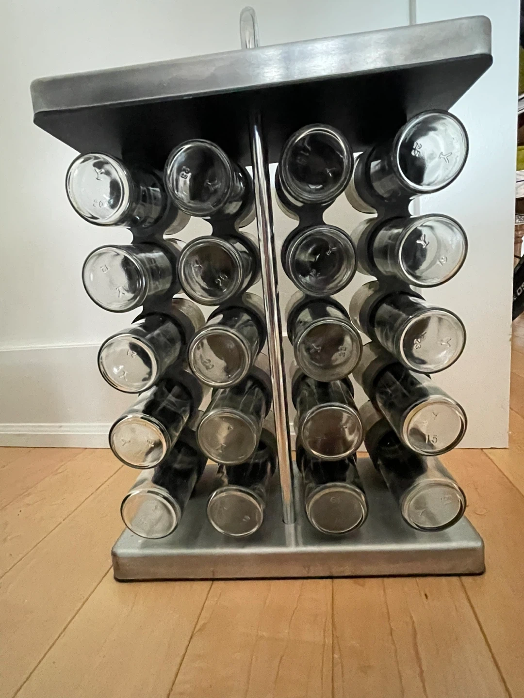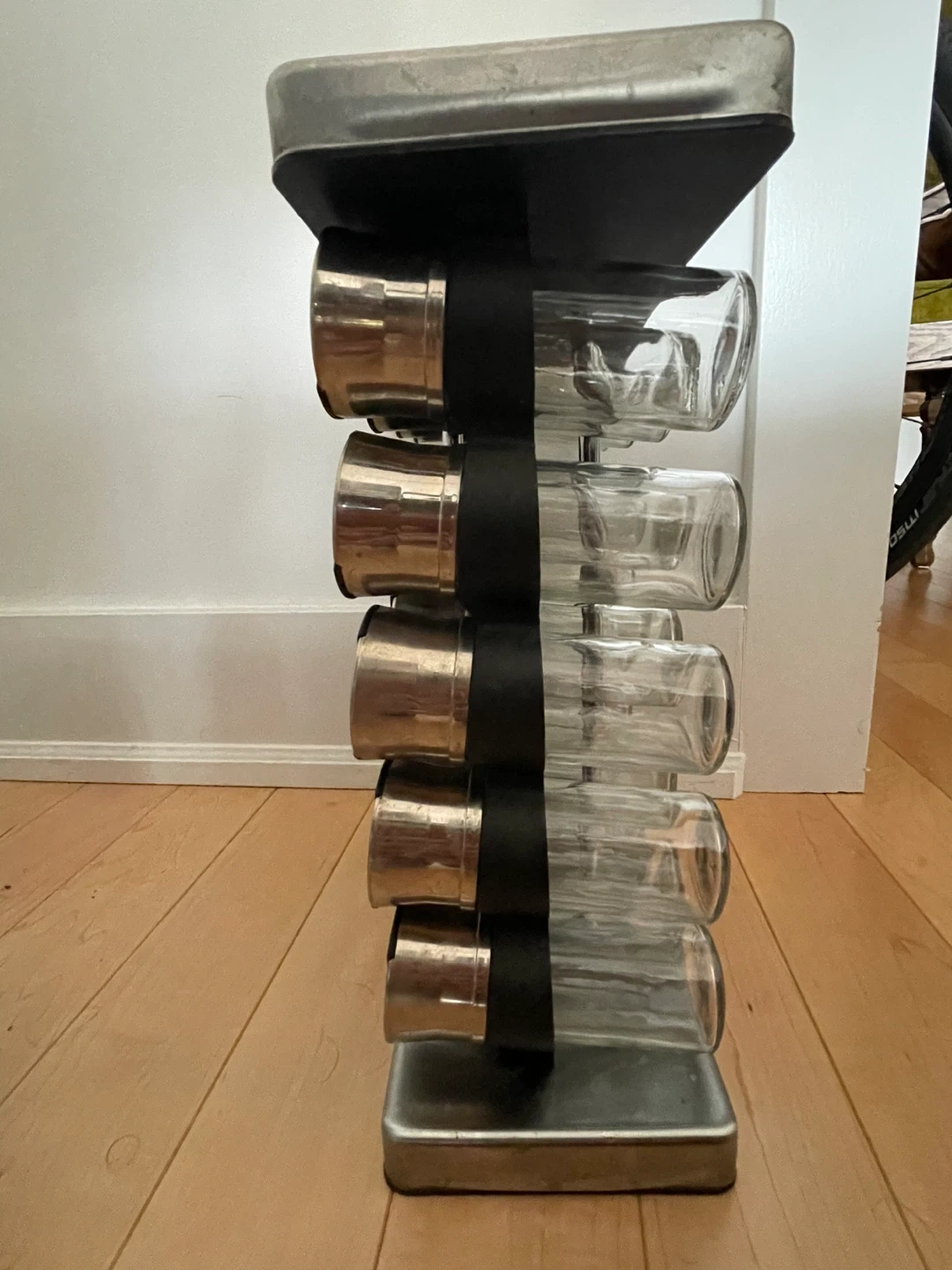 Selling a spice rack with 20 jars, labelled with spice/herb names. Each jar has a labeled lid for easy identification of your spices like basil, bay leaves, cumin, etc. I was previously using this for my spices but have upgraded to something larger. Everything is clean and ready to use