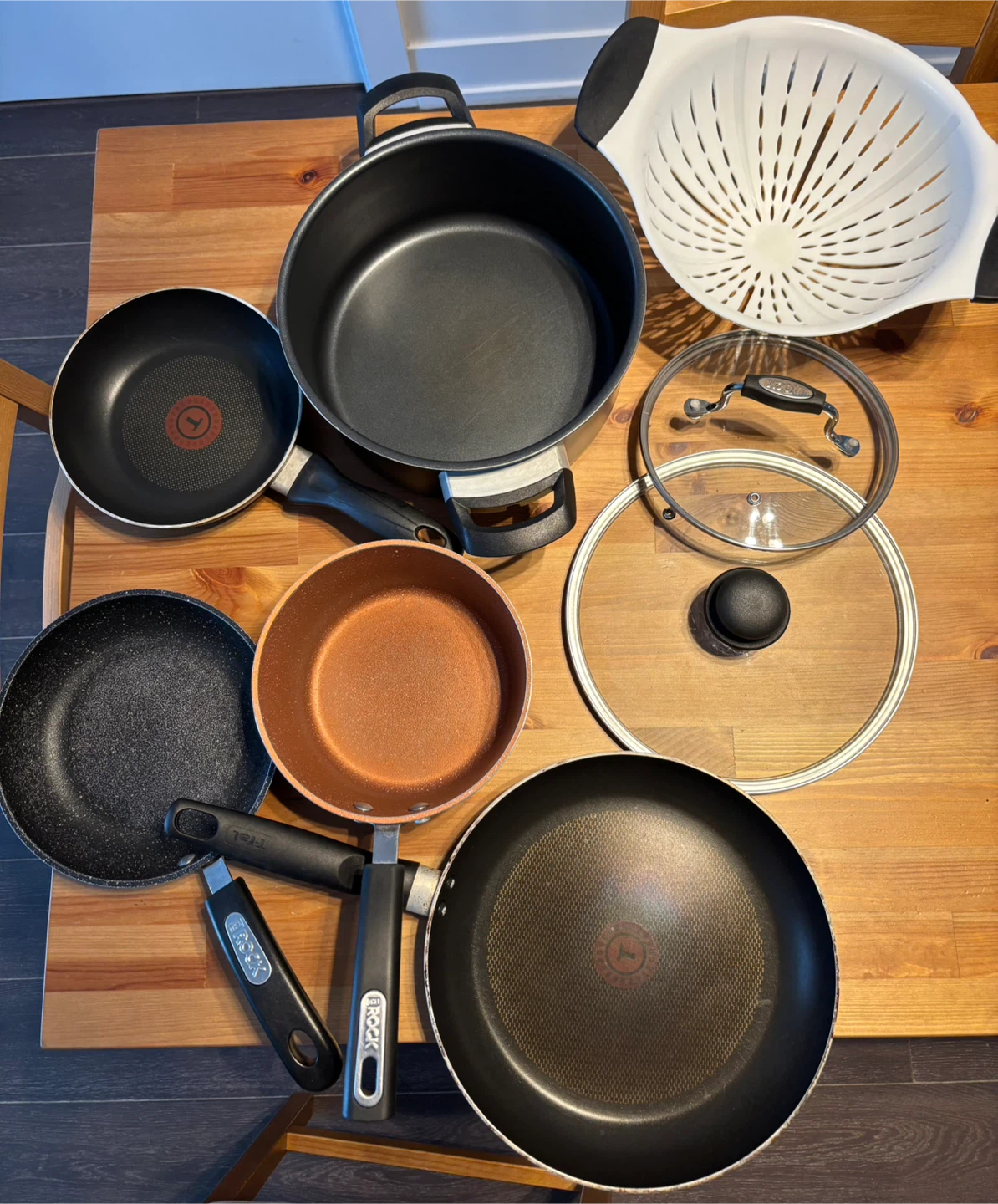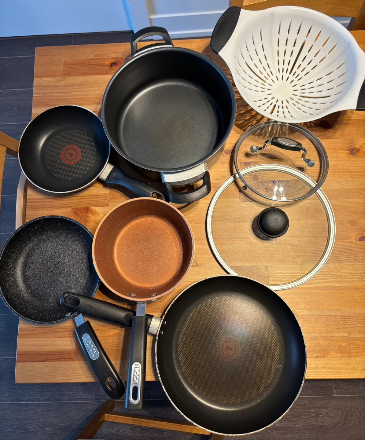 Selling a cookware set that includes items from T-fal and The Rock! There's a variety of frying pans, pots, a colander, and lids.