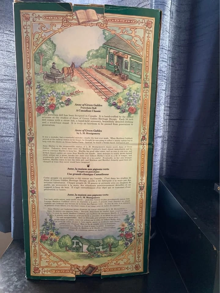 By Canadian company Avonlea Traditions inc. Doll is 16” and comes with wooden/metal stand that has a plaque that says Anne of Green Gables.